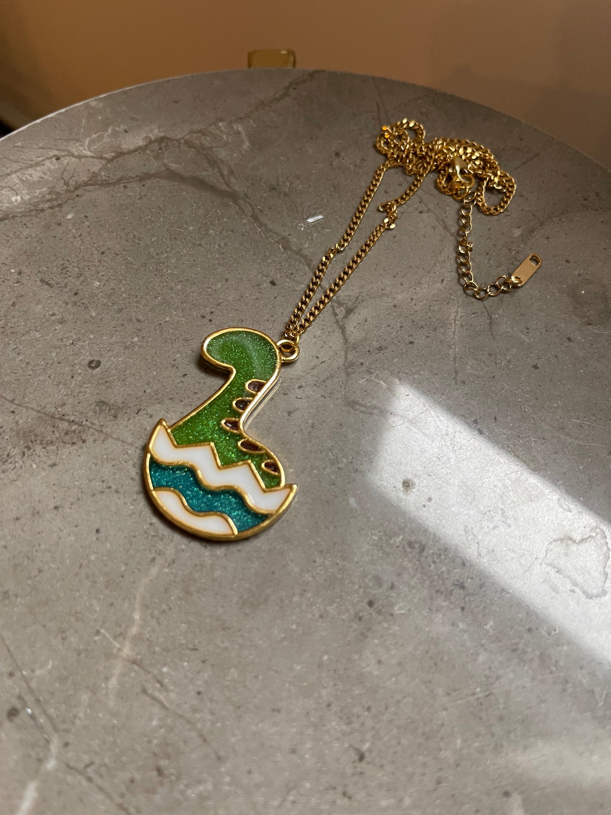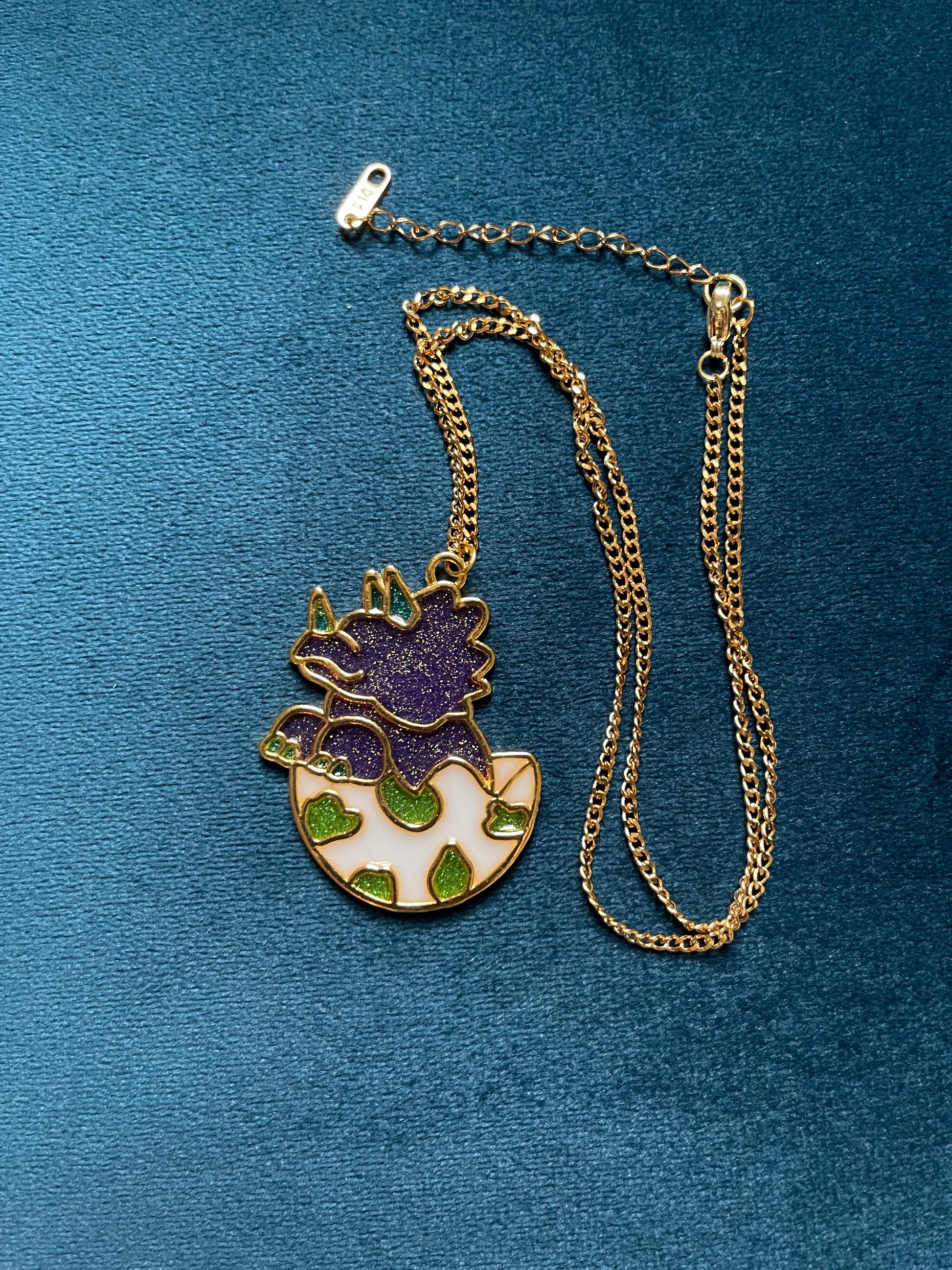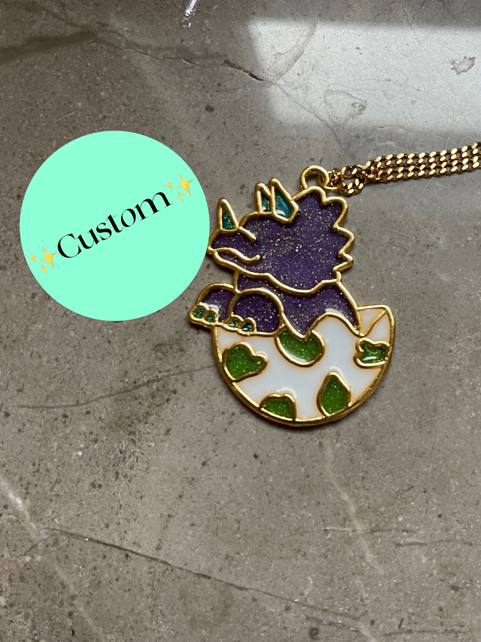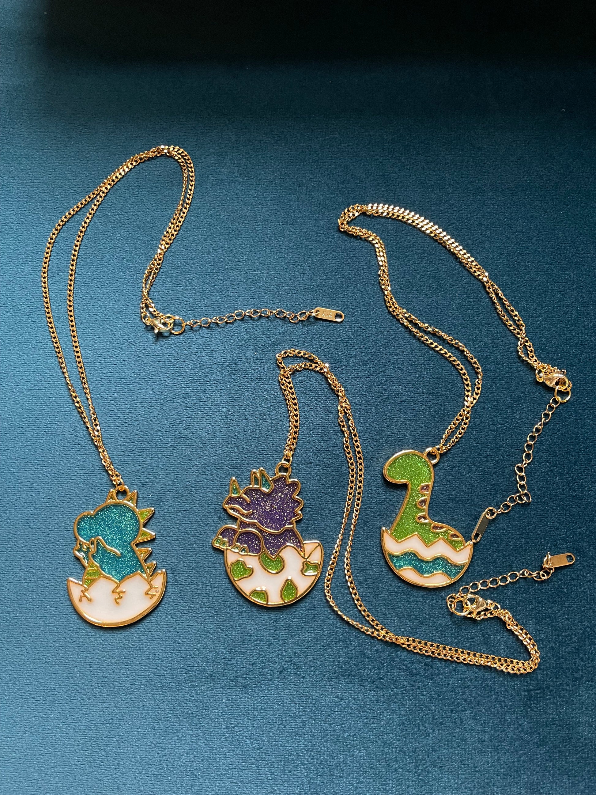 By default, necklaces will be made with glitter resin for the dinosaur and flat white/glitter for the egg shell portions. The primary color will be the color of the dinosaur. I will pick accent colors to complement the primary color, but if you would like something particular, please add a note to your order. If you would like to specify anything, please reach out! Color combinations, multiple finishes (such as pastel or shimmer), and even lettering are available. I want to ensure you receive the absolutely ideal necklace that is perfect for you in every way. Thank you so much for visiting my shop!