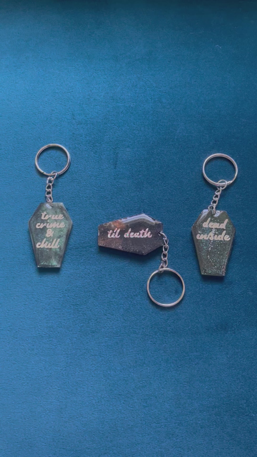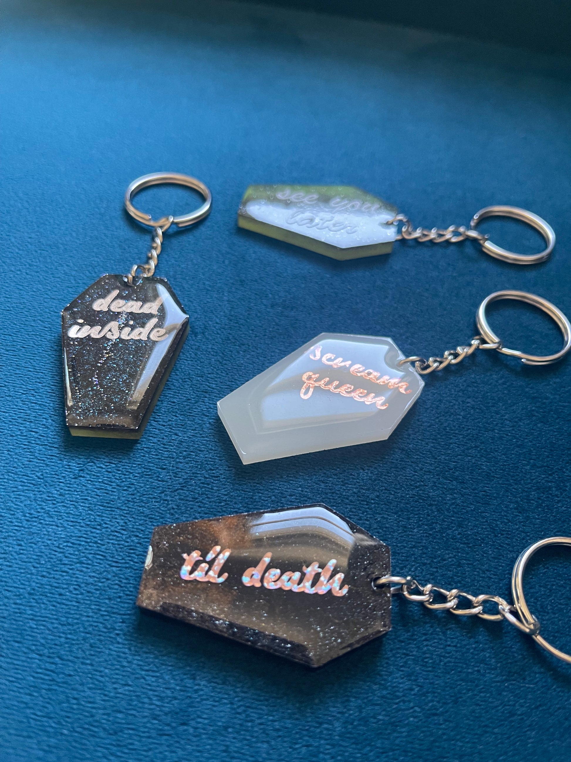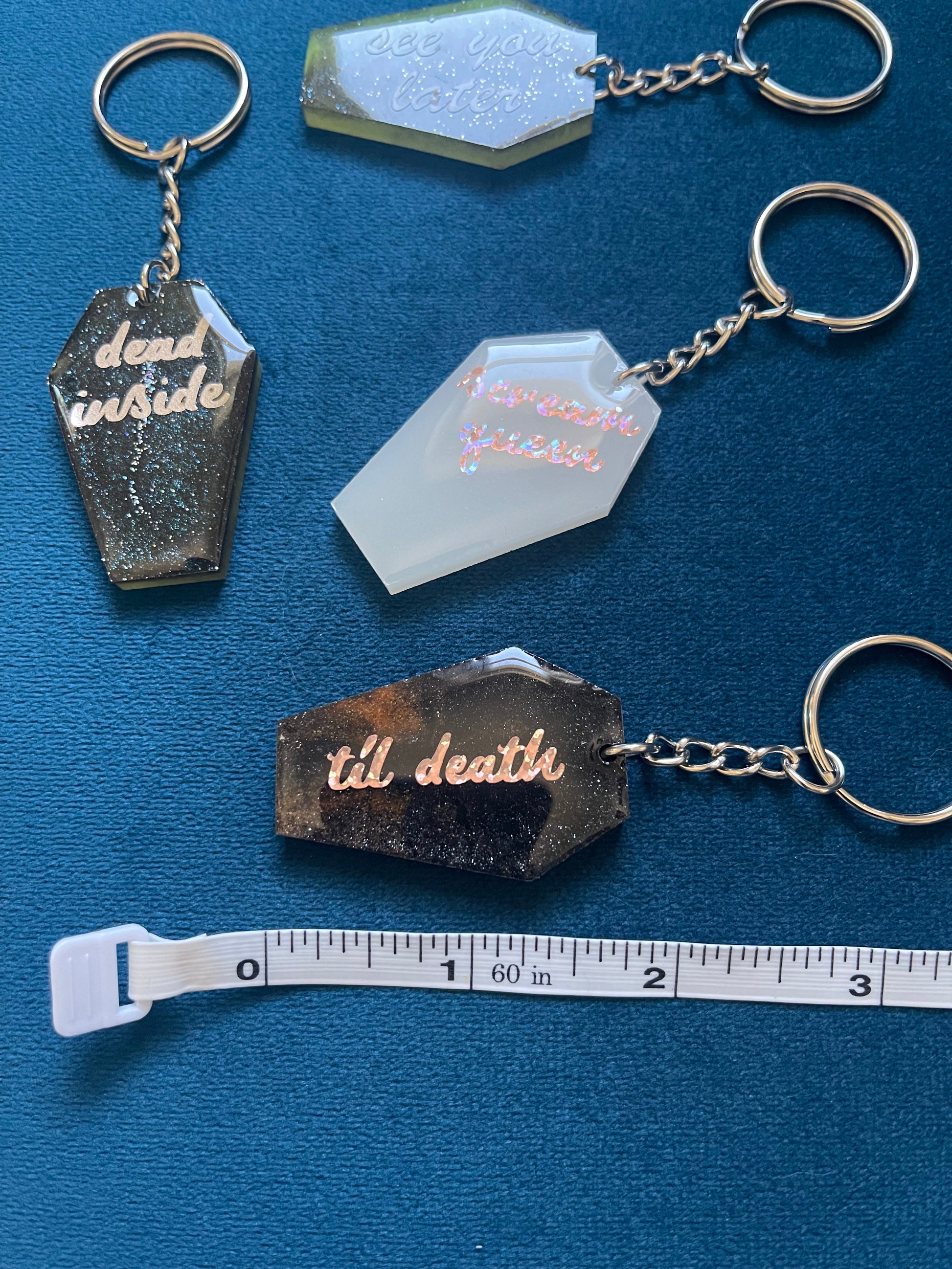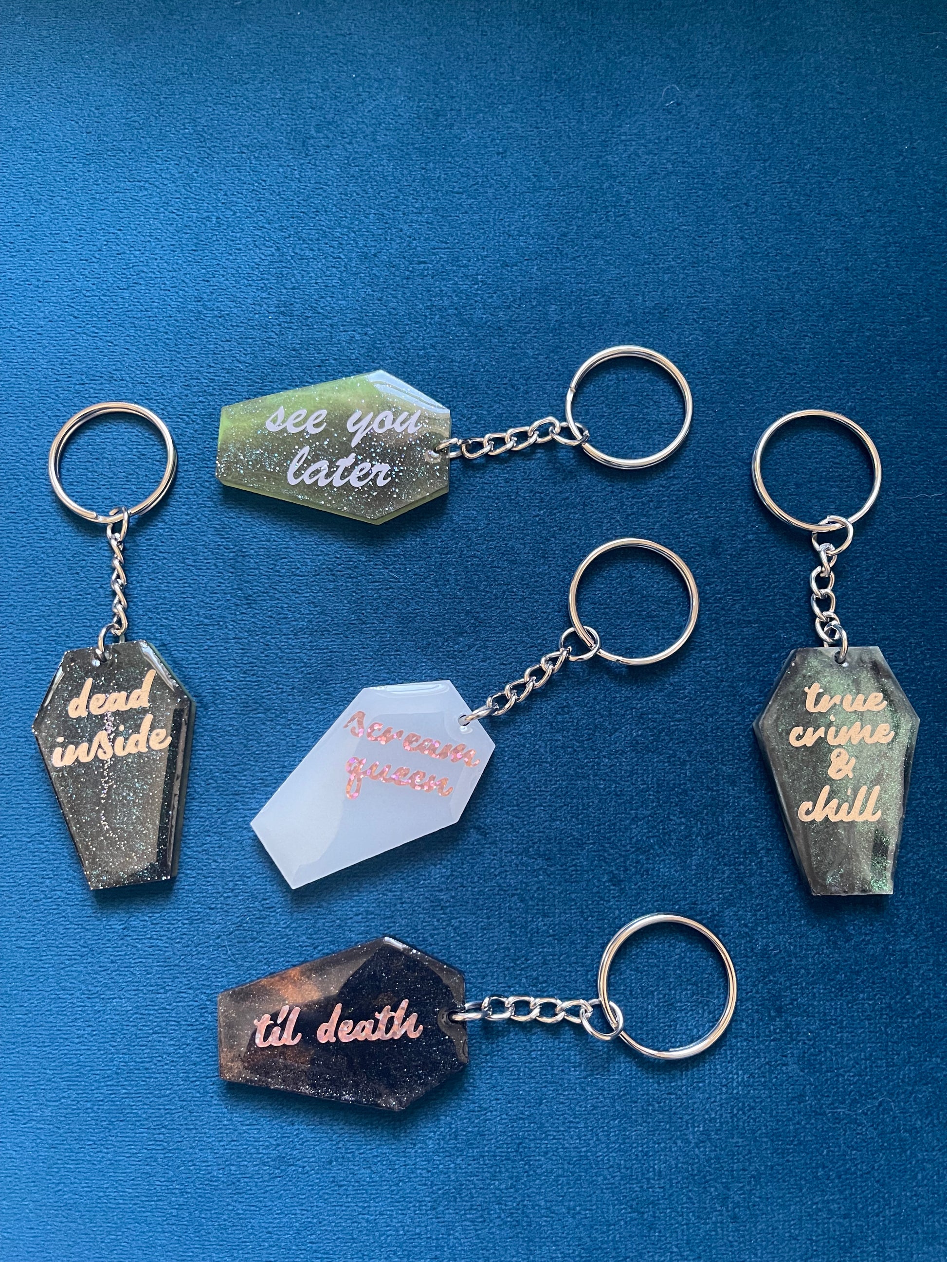 Your new favorite snarky and spooky keychain! Slick and shiny, this coffin keychain is made with your choice of resin and catchy phrase. The perfect accessory for your keys, lanyard, badge, or anywhere you need a dose of creepy and cute!