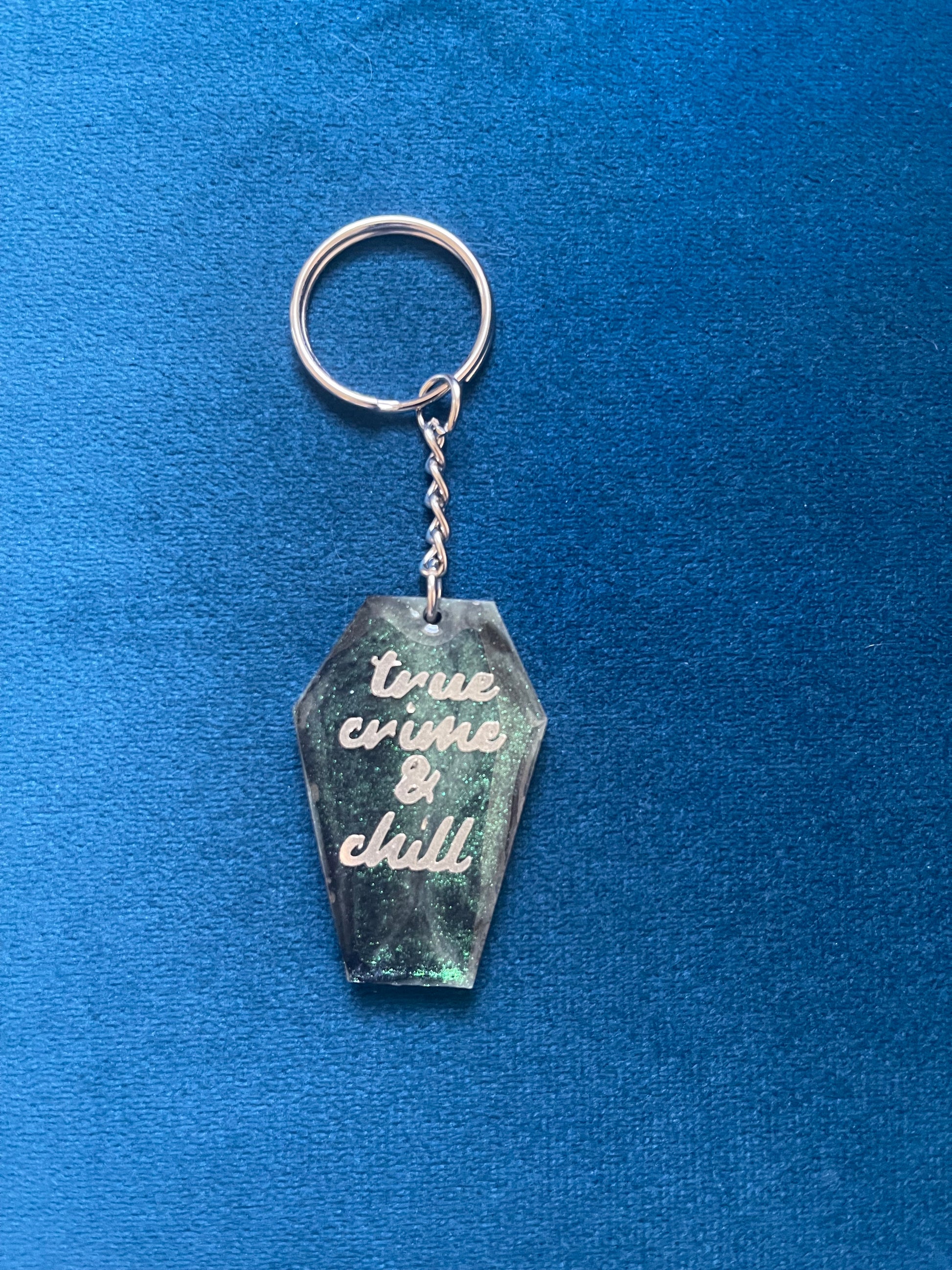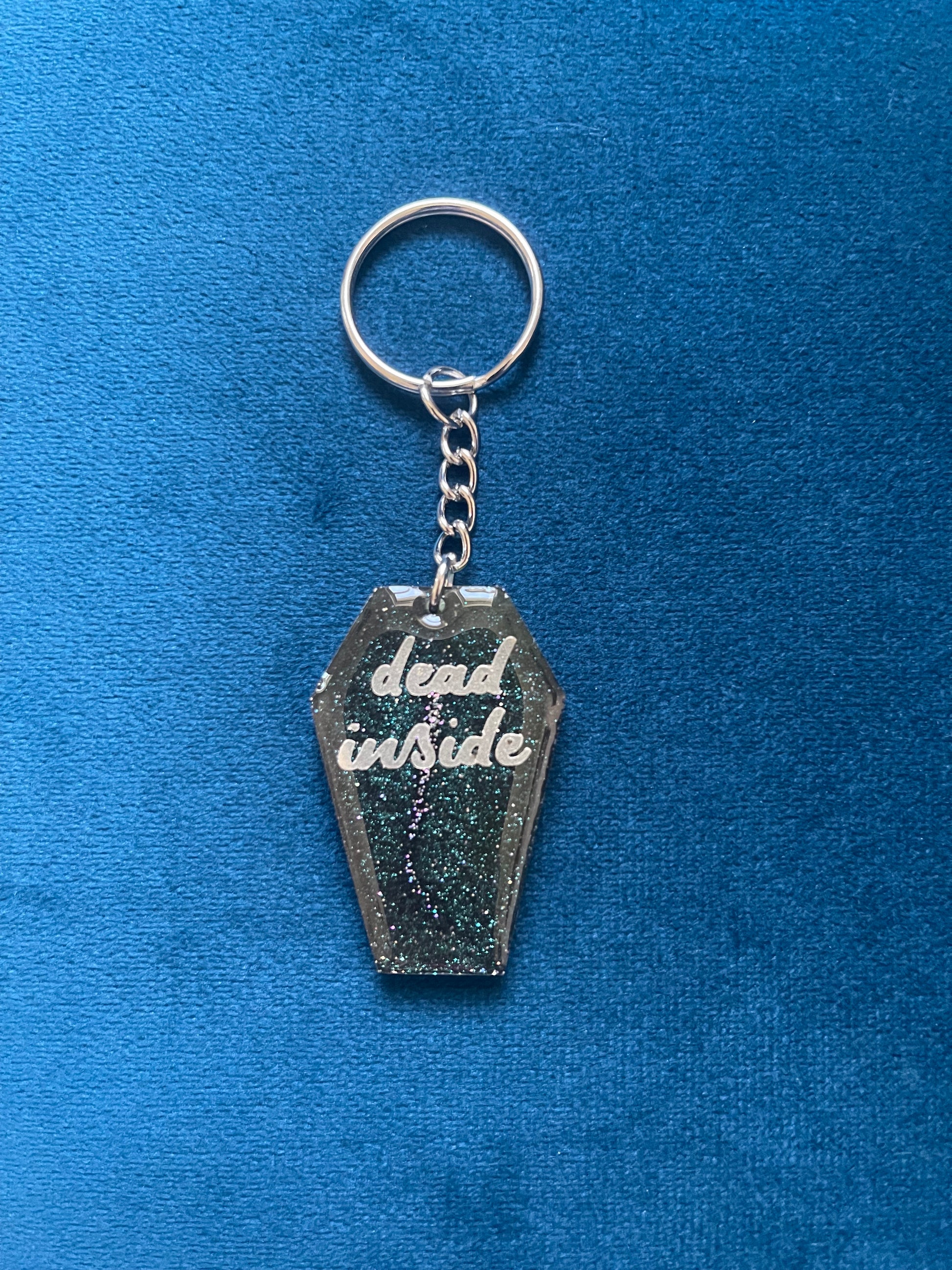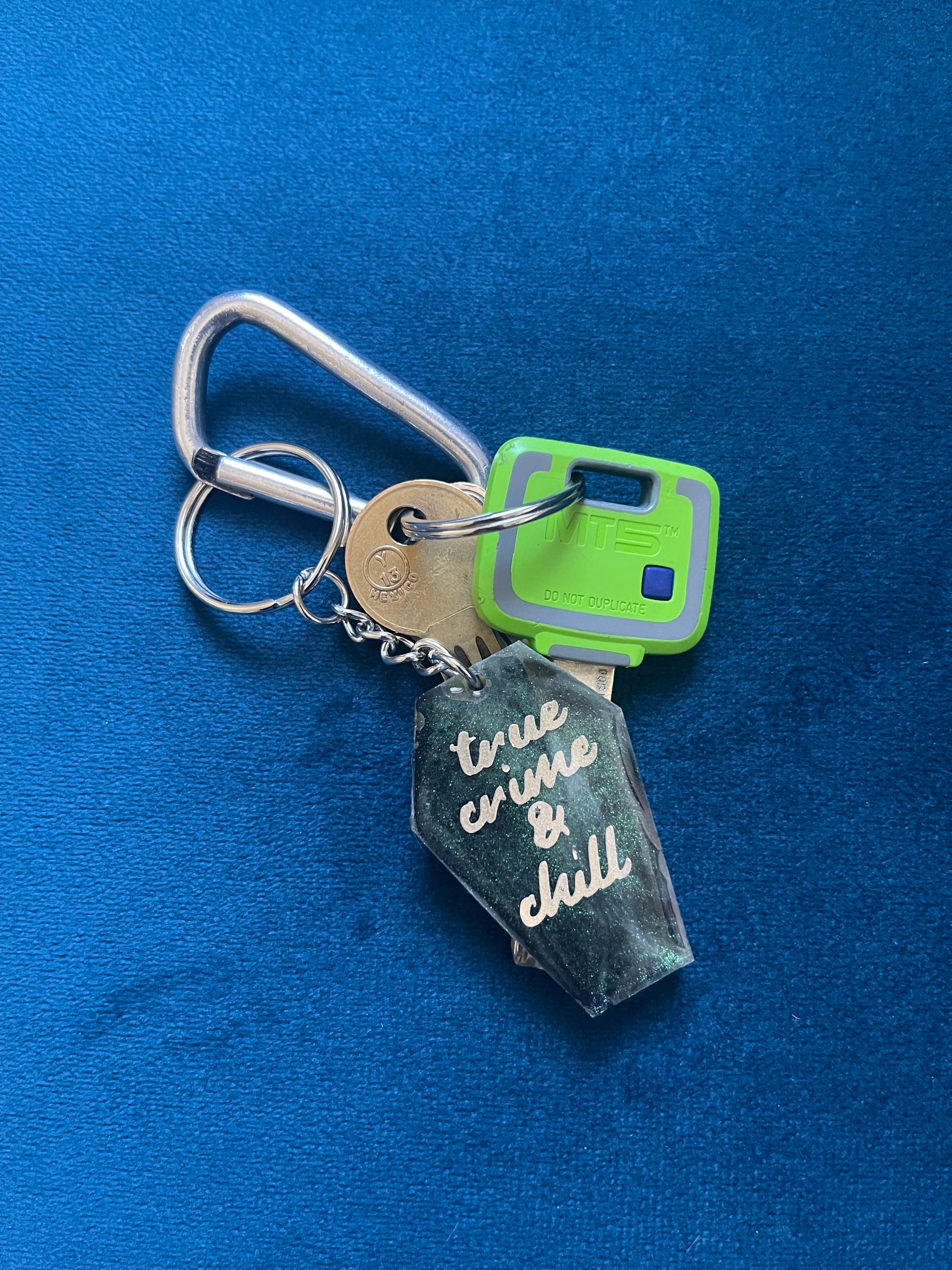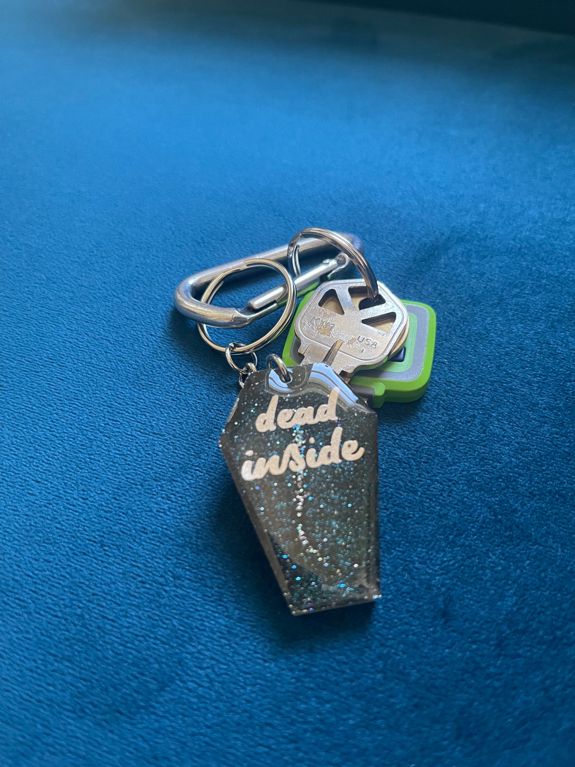 Your new favorite snarky and spooky keychain! Slick and shiny, this coffin keychain is made with your choice of resin and catchy phrase. The perfect accessory for your keys, lanyard, badge, or anywhere you need a dose of creepy and cute!
