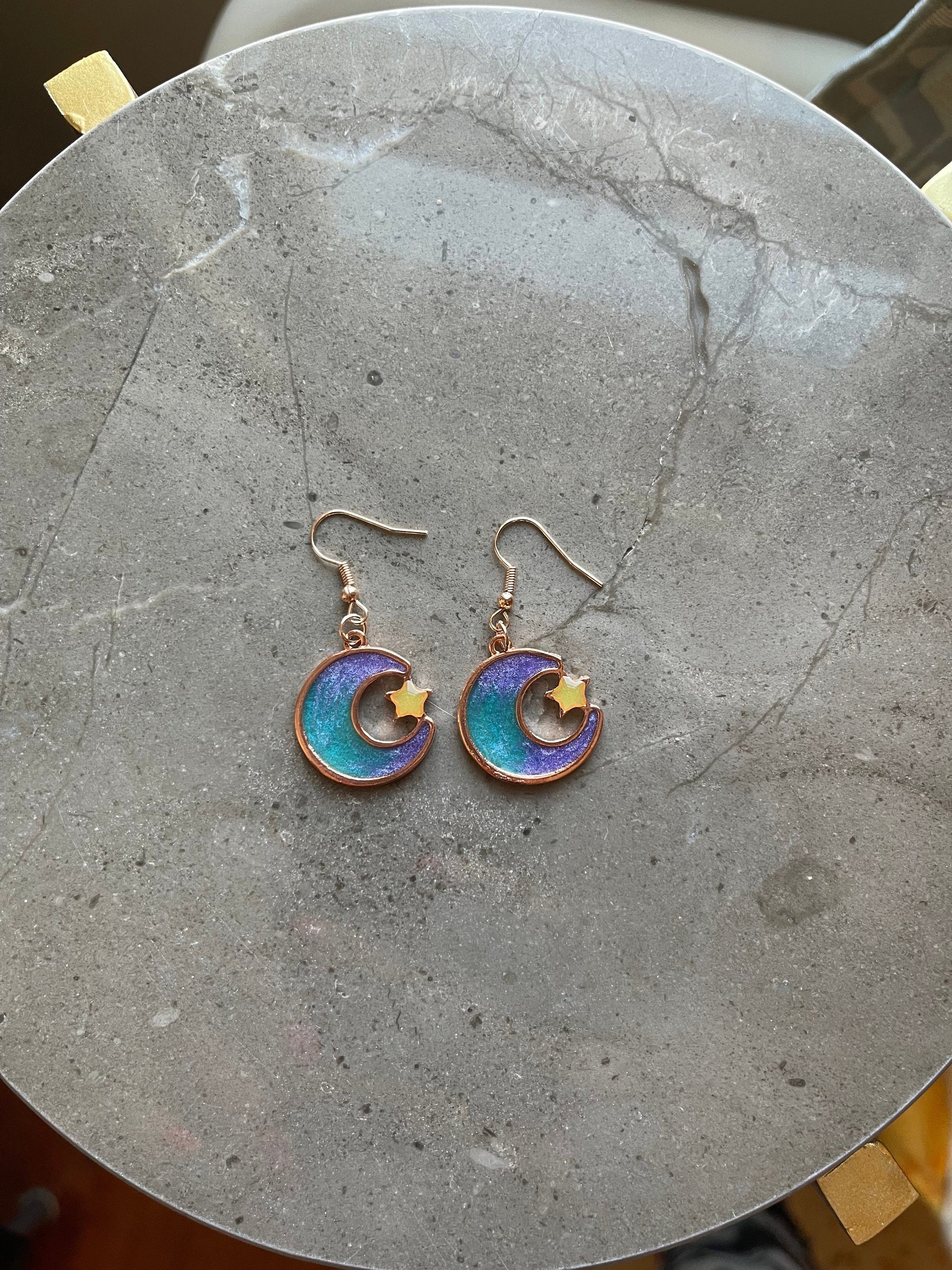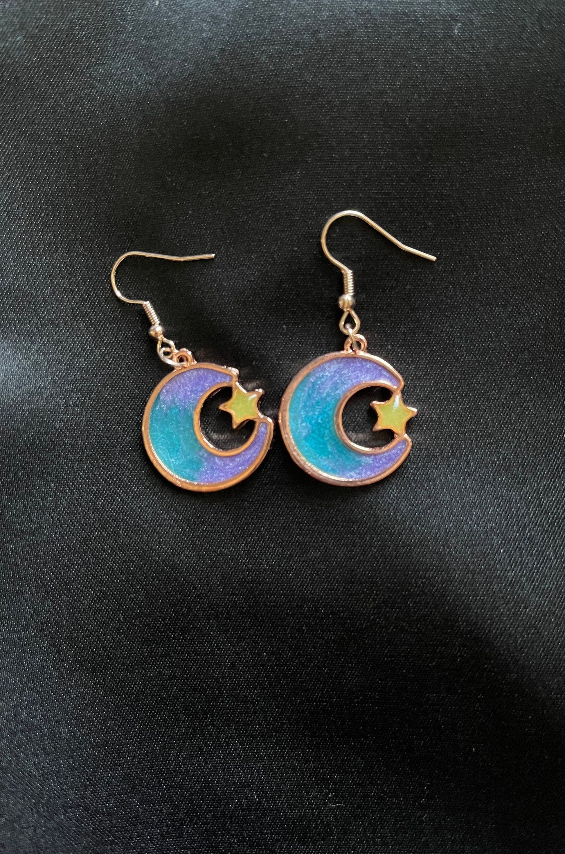 Earrings are set in gold-colored settings. The pair shown is purple and blue with a shimmer finish. If you would like to customize any other aspect, please let me know. I want to ensure you receive your absolutely ideal pair of one-of-a-kind earrings!