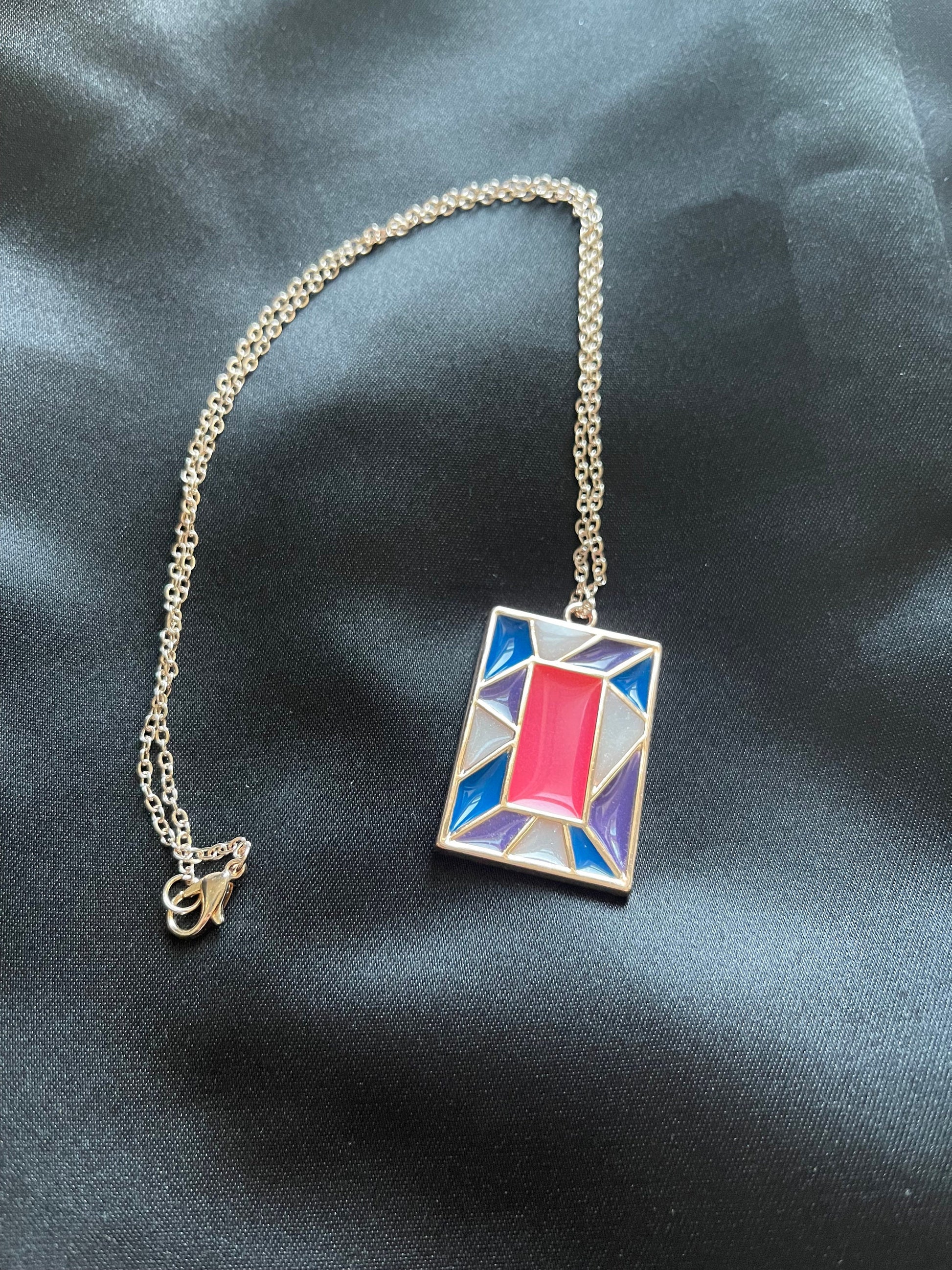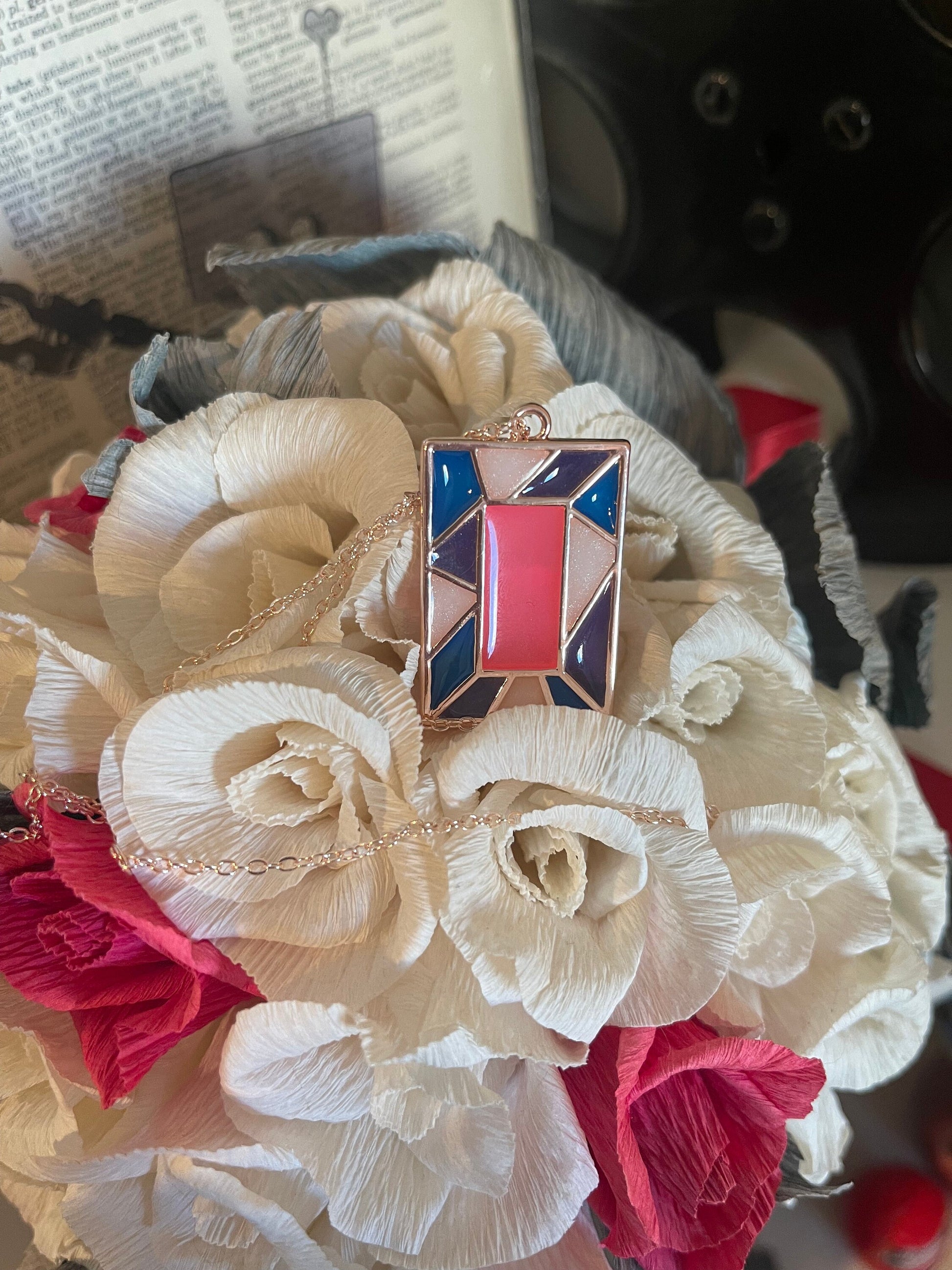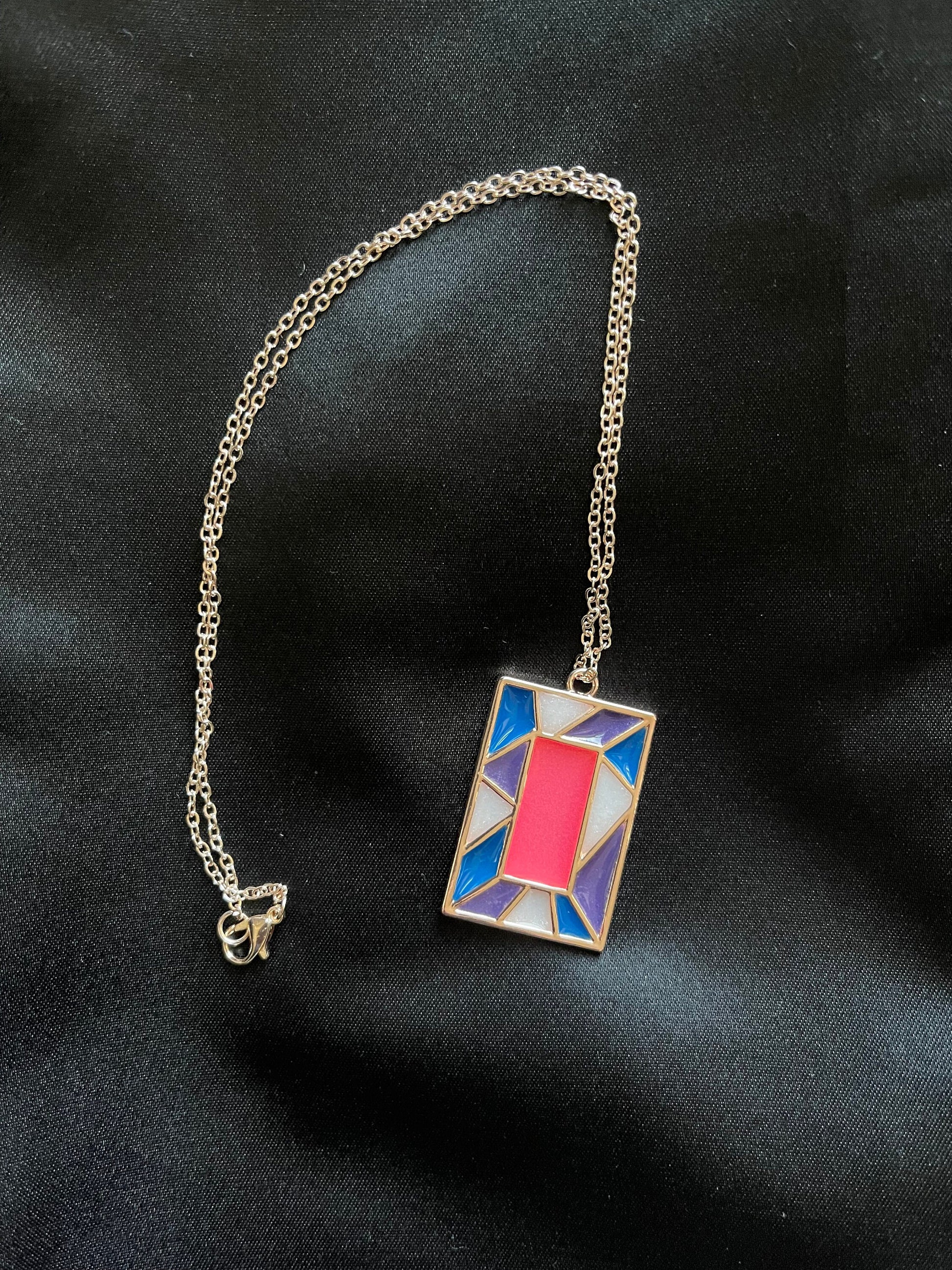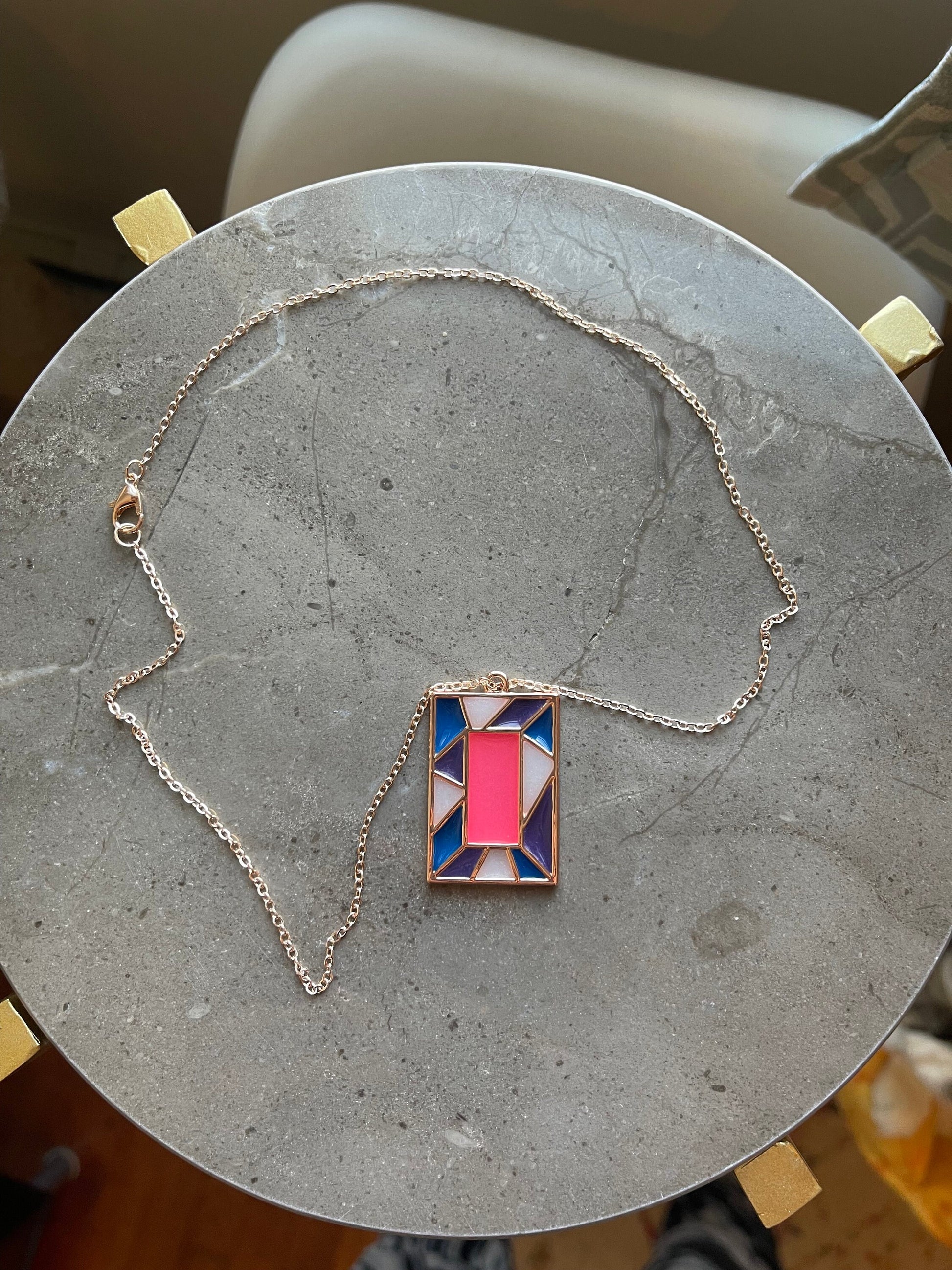 A bold and beautiful resin necklace in the style of stained glass. Customize your dream necklace and create a one-of-a-kind item that is uniquely you! The necklace shown is alternating shimmery blue, purple and white, with a bonus glow-in-dark pink center! Encased in a gorgeous rose gold setting, this customizable necklace is the perfect accent for spring.