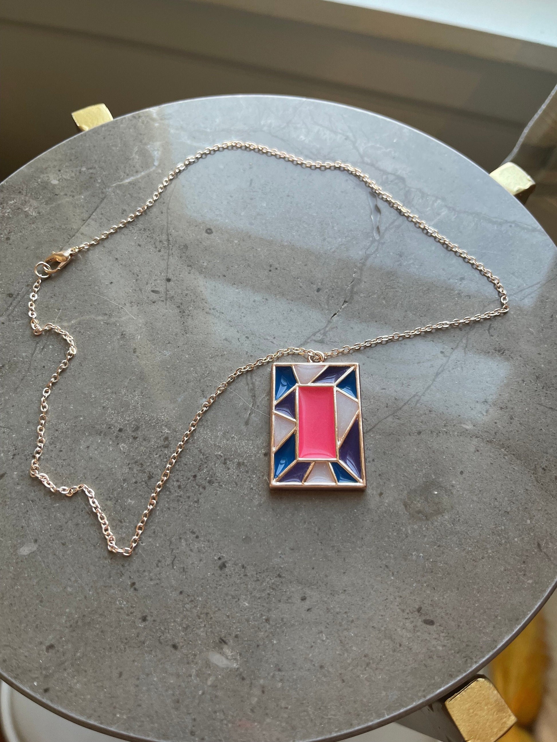 The rectangle pendant measures approximately 1.5 inches in height and 1 inch in width. The necklace chain is approximately 18 inches in length.