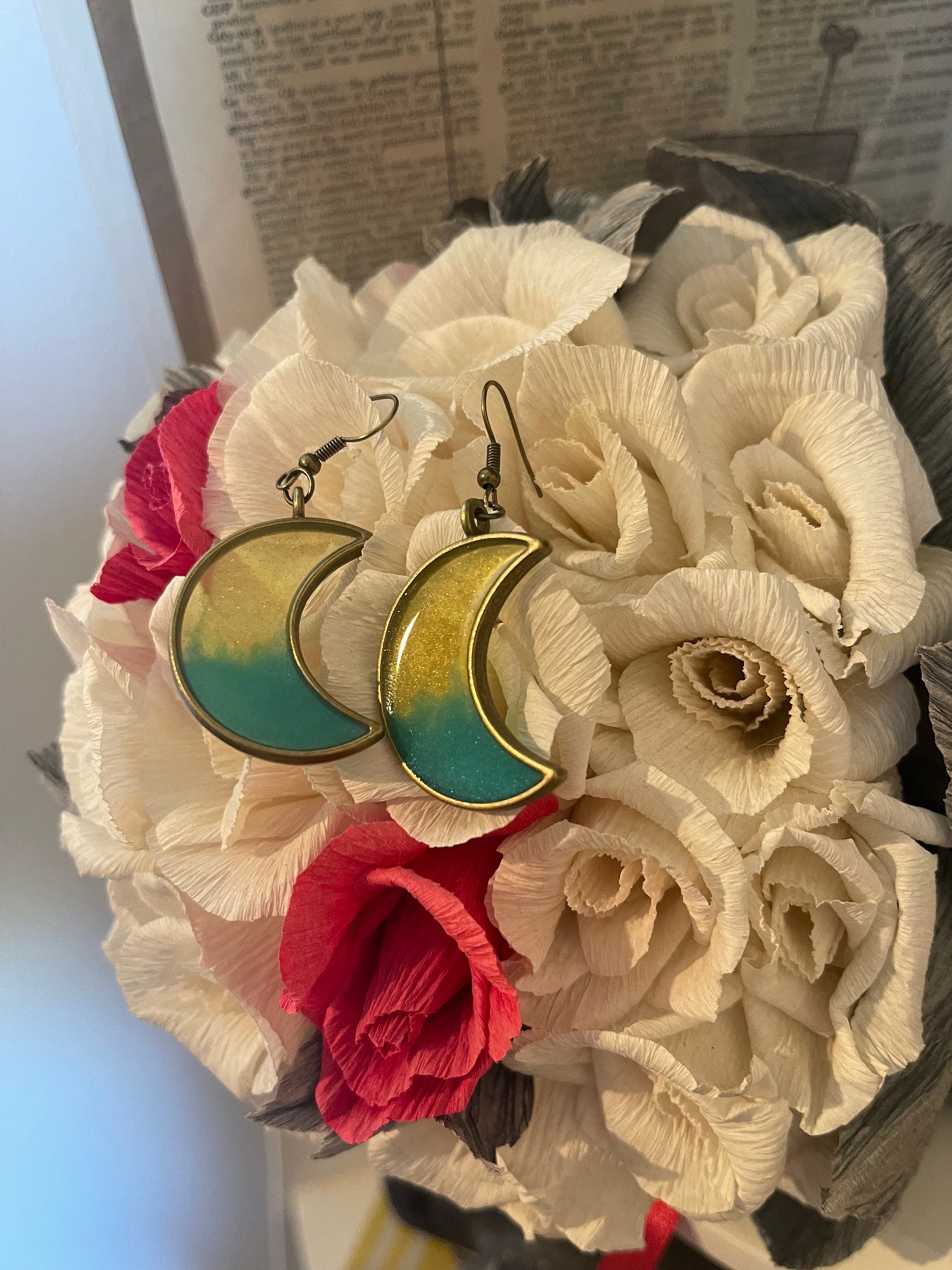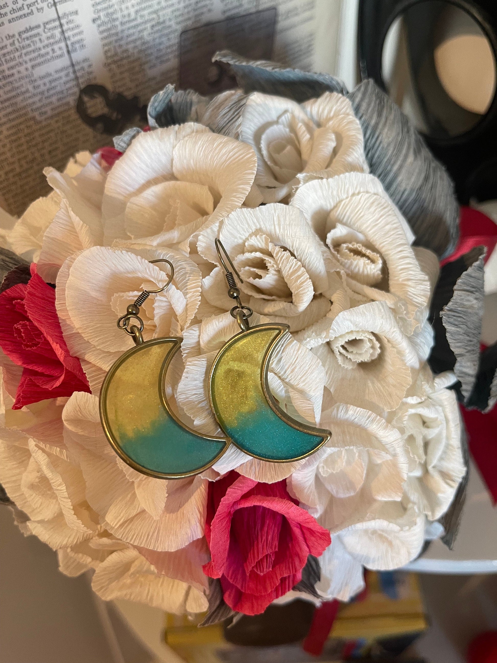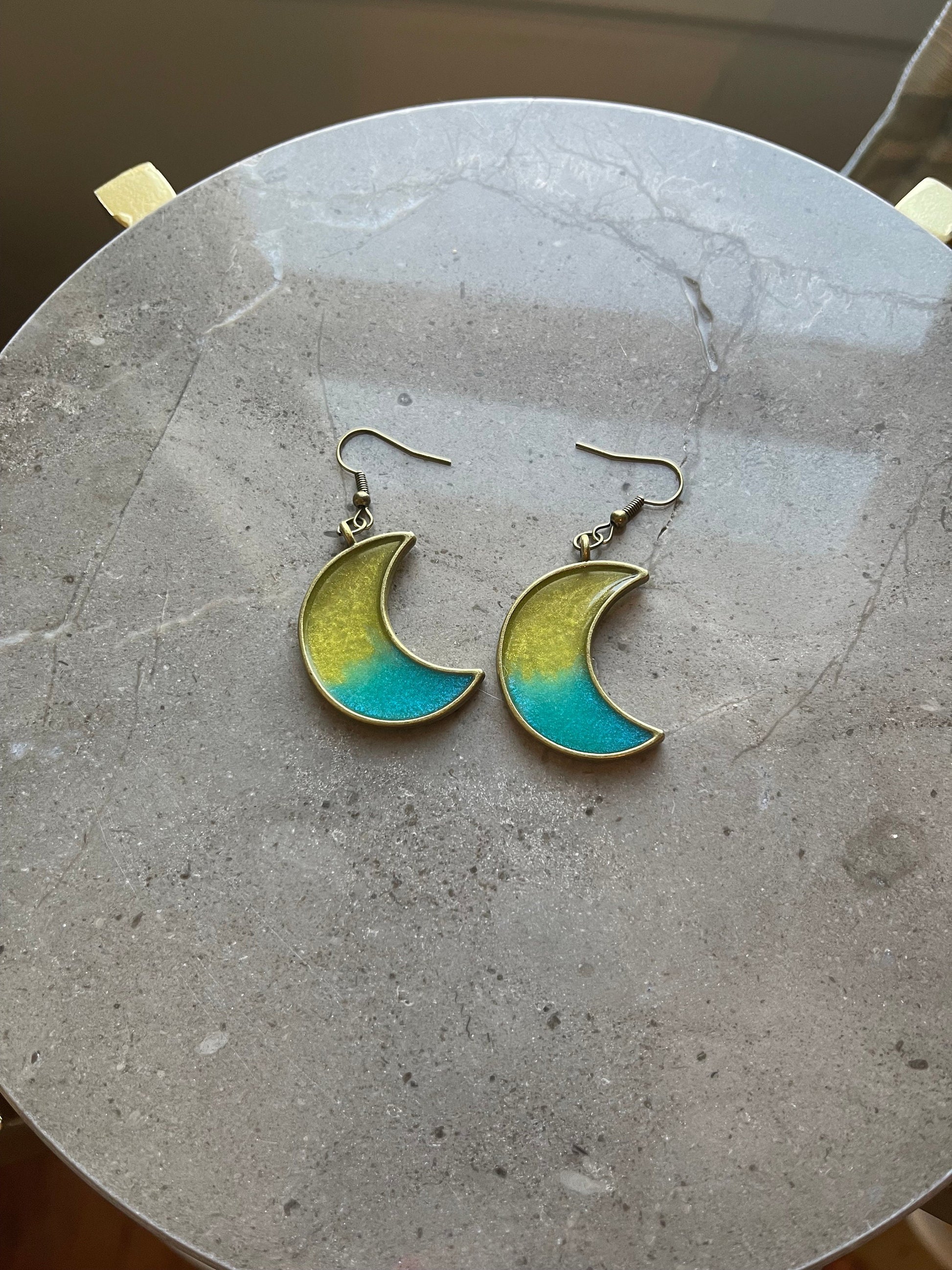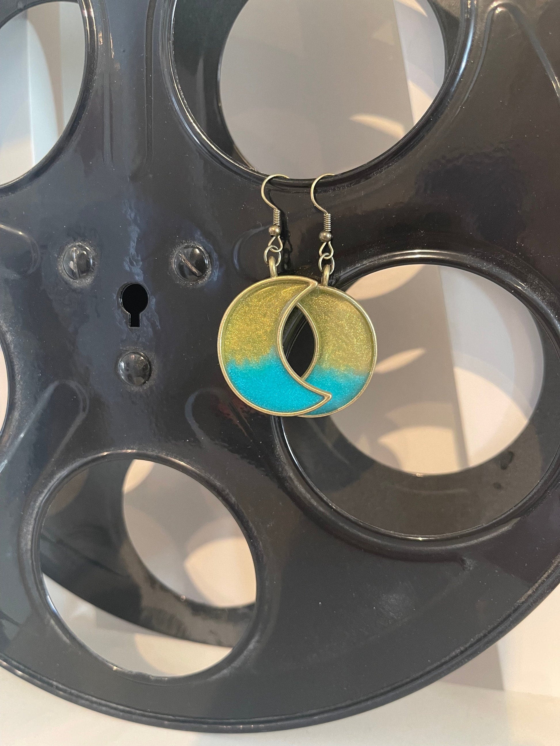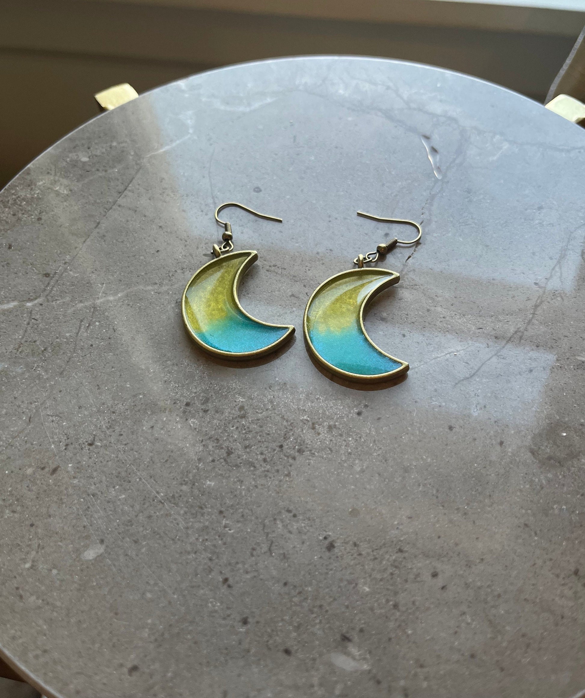 Your new favorite earrings! Bronze moon settings beautifully frame two-tone resin, in your choice of color and finish! These earrings are customizable to your exact desires, create your one-of-a-kind pair!