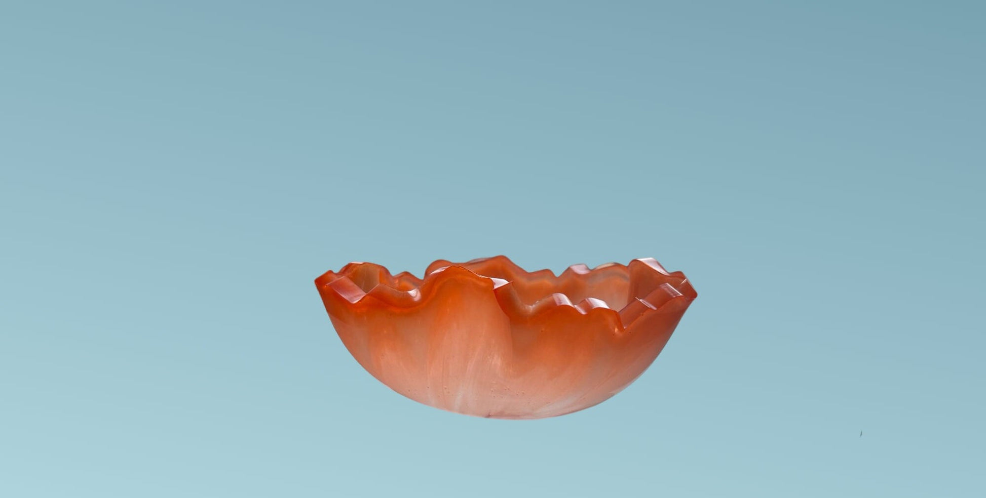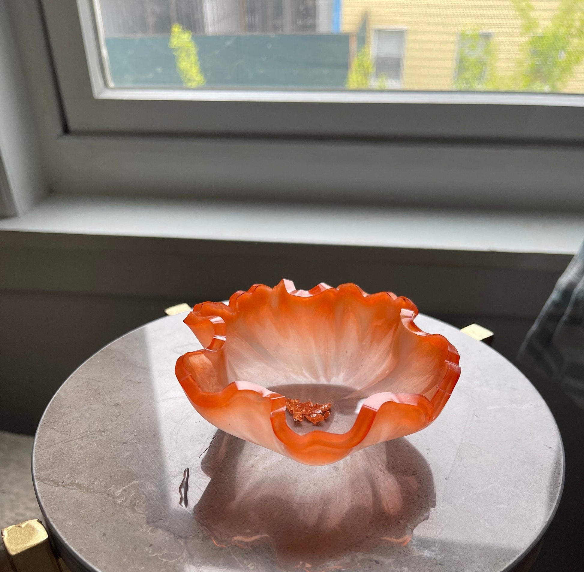A gem of a one-of-a-kind handmade resin bowl. With a bold orange rim gently cascading into a translucent center with delicate gold lacing throughout, this bowl is the perfect elegant accent piece. Whether you need a place to store your gorgeous jewelry, or a classy place to toss your keys this dish has you covered!