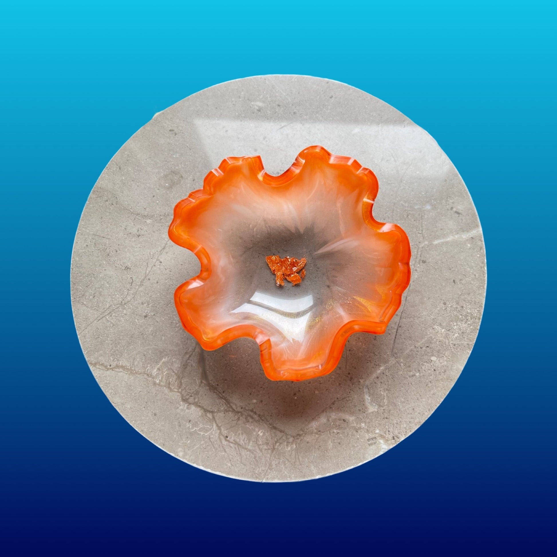 This listing is for an orange, white, and translucent trinket dish, but custom orders are available as well! Dishes can be customized with resin of any color of the rainbow and a variety of finishes (matte, translucent, shimmer, glitter, pastel, glow in the dark, color shifting). Please reach out to order your one-of-a-kind item!