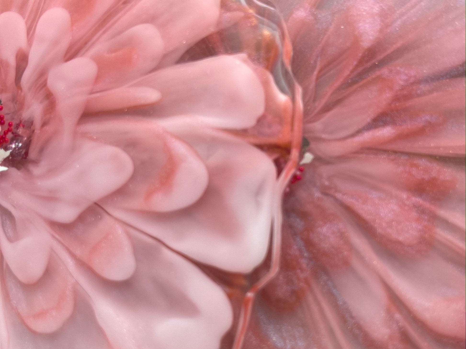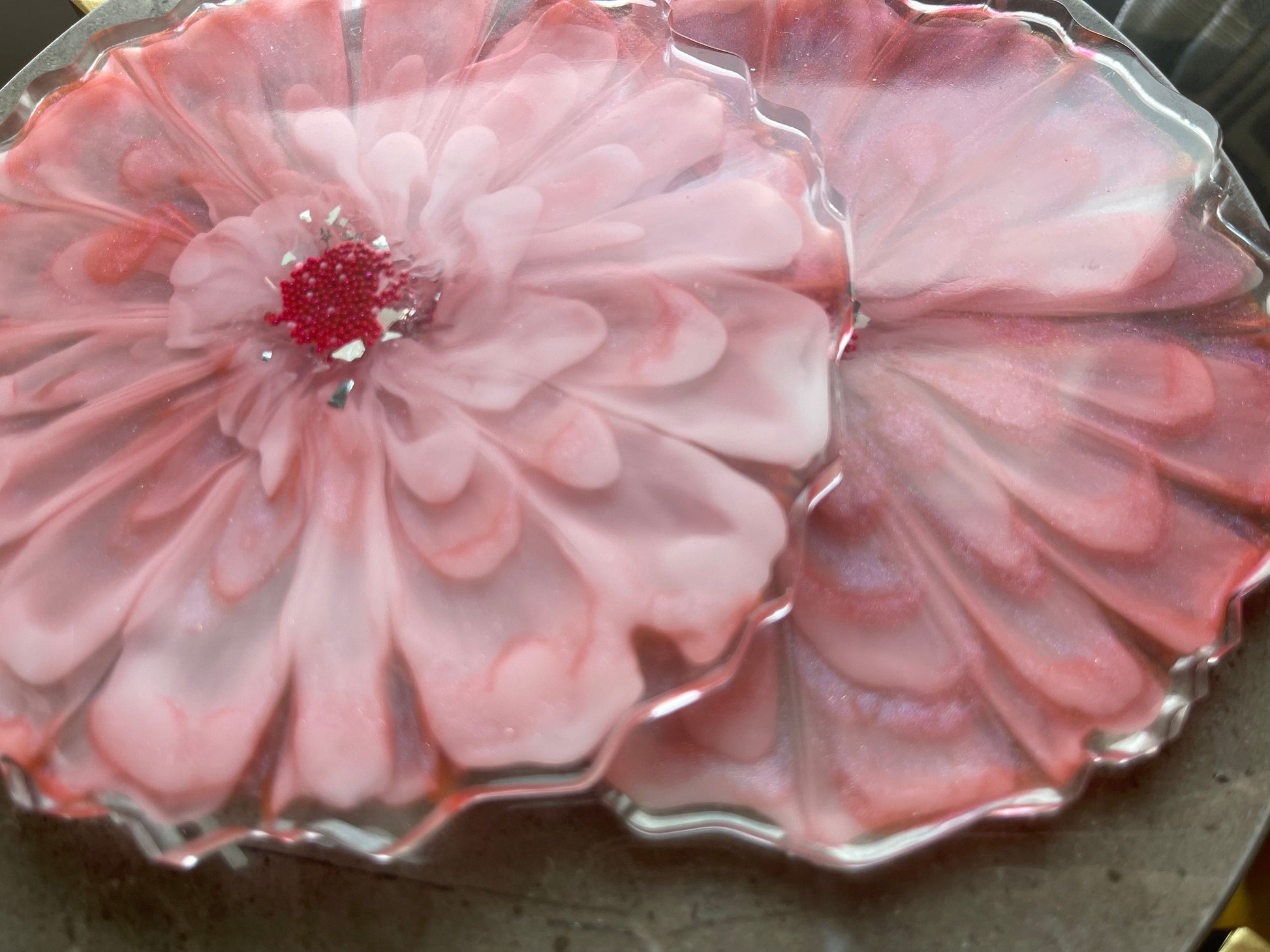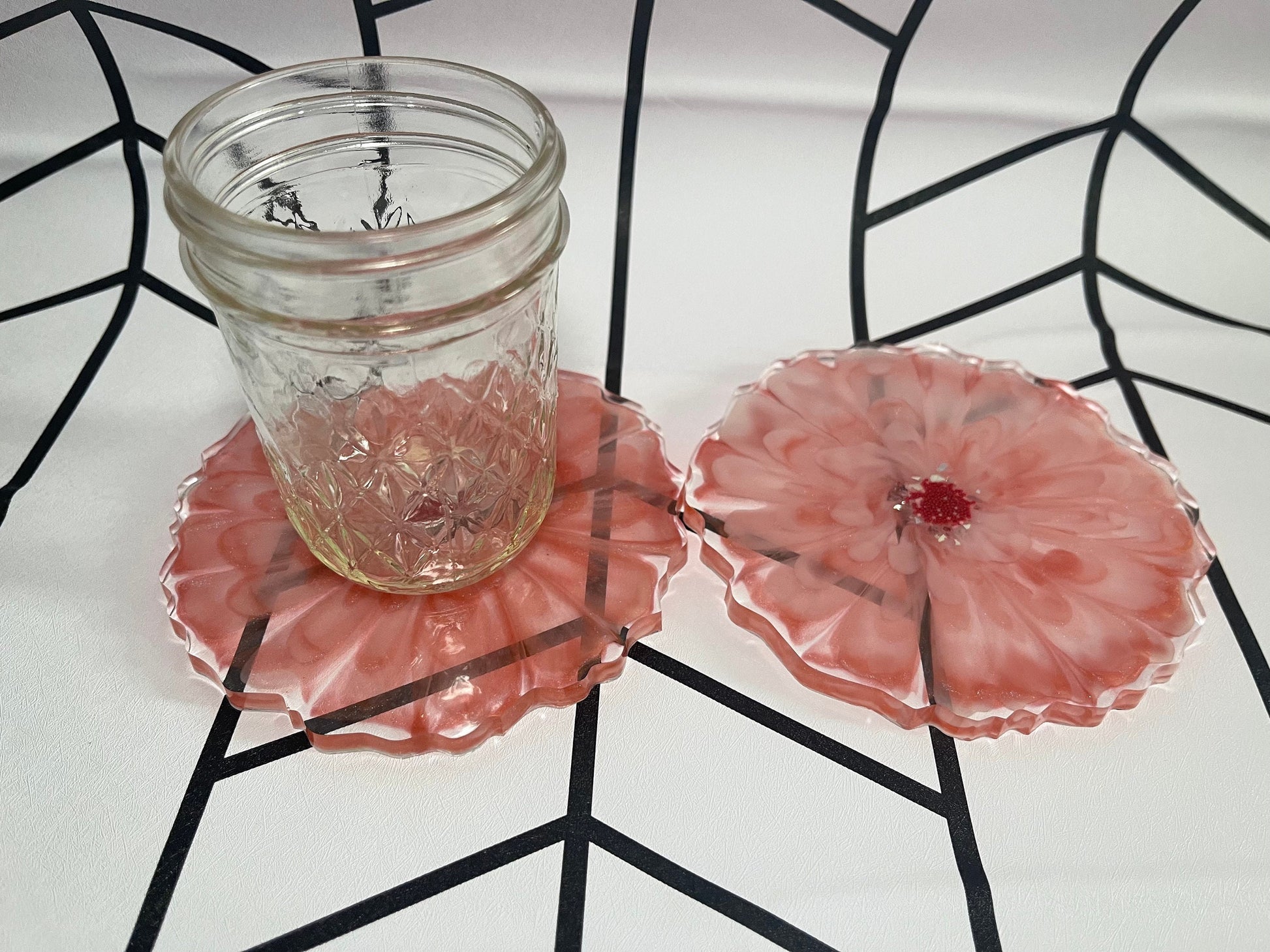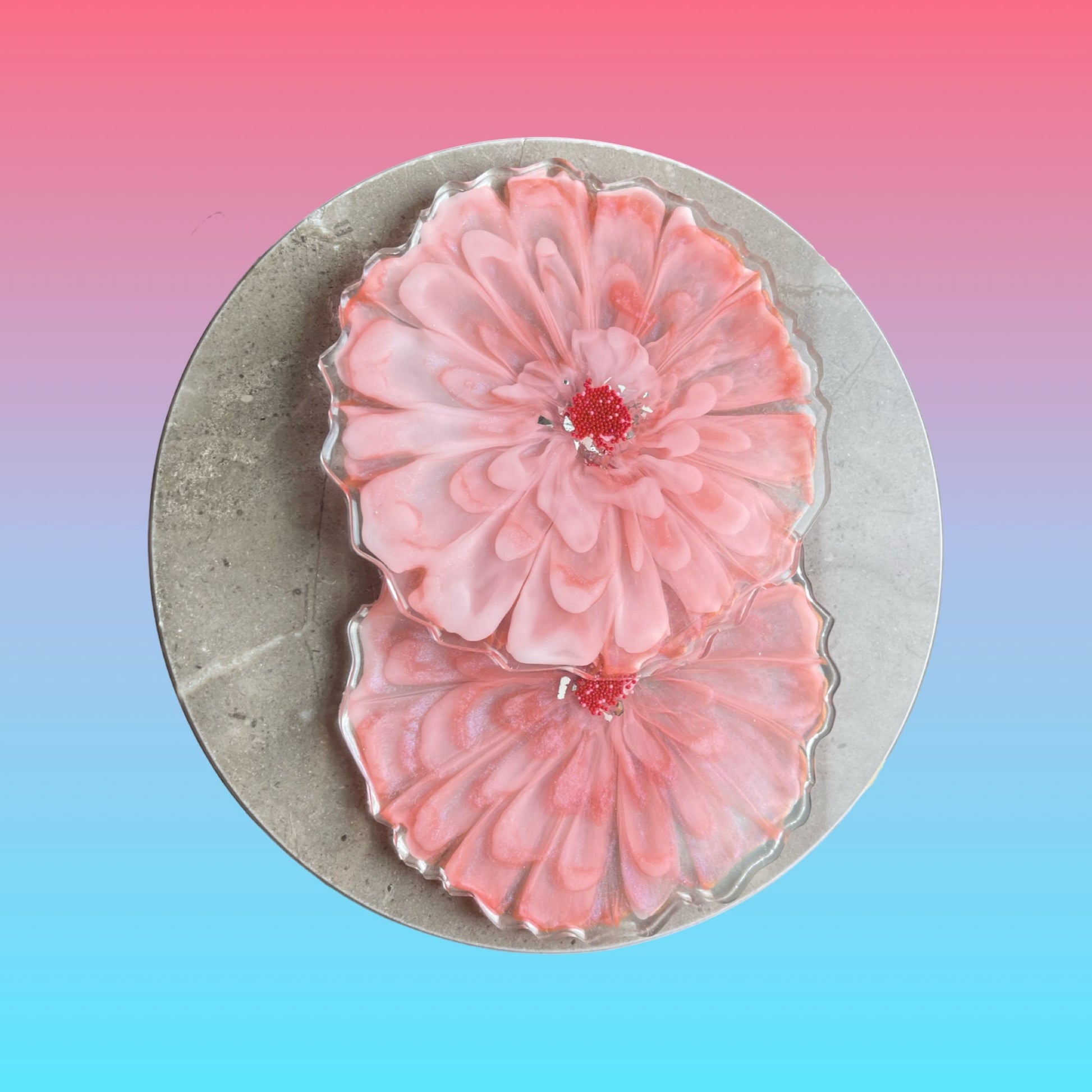 A pair of fantastically floral resin coasters! Featuring delicate color blooming throughout, and shimmering color swirling toward a bejeweled center, these coasters look gorgeous from any angle. The perfect place to set down your mug of tea or flute of champagne, these coasters do it all!