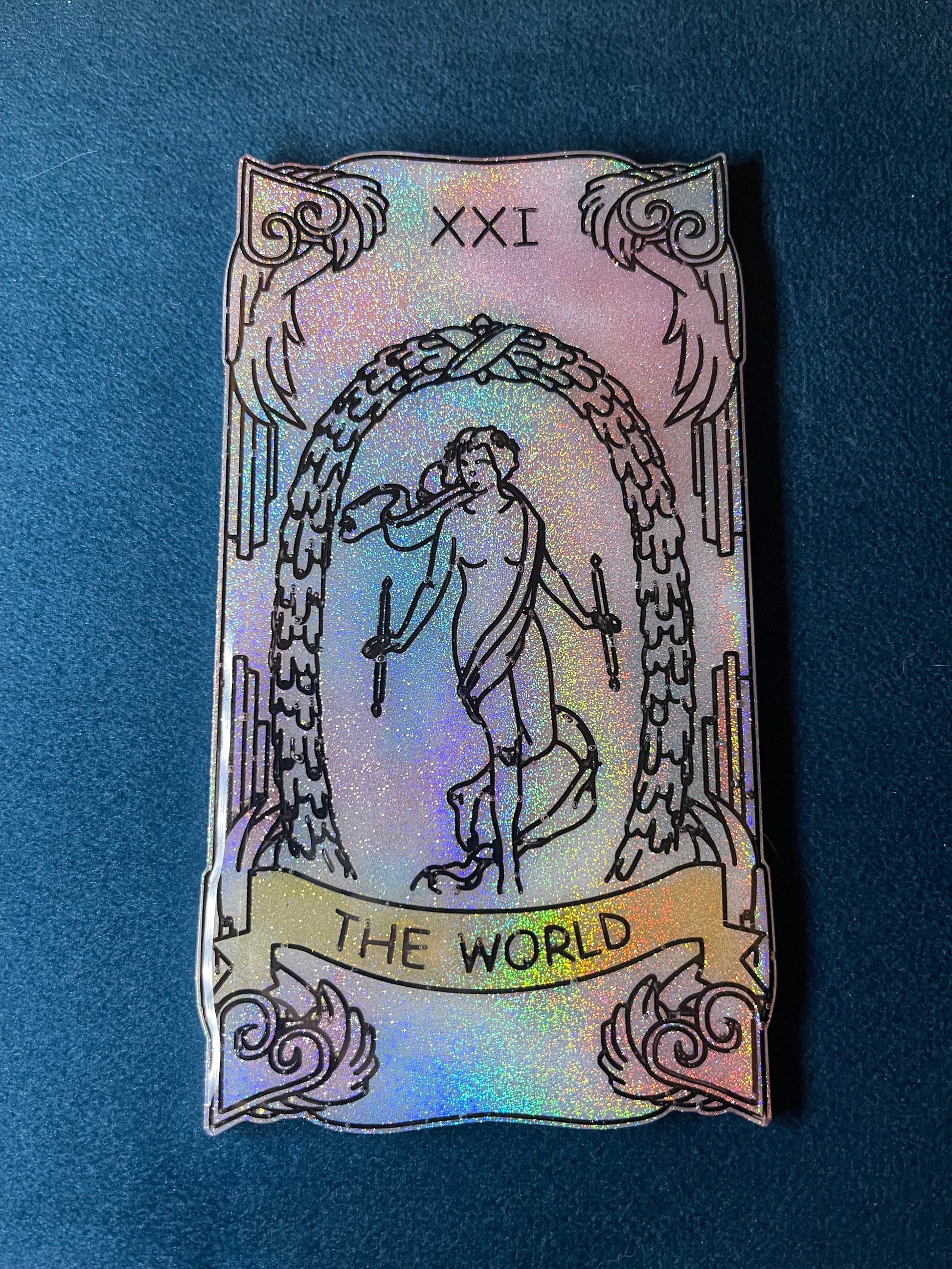 A set of 4 handmade resin tarot cards. These one-of-a-kind tarot cards are hand-poured in resin and feature hand-painted black details. The set includes The Sun, The Moon, The World, and Judgement in glittering silver, pink, purple, blue, and gold. The holographic glitter gives a beautiful rainbow effect; these cards look gorgeous from any angle!