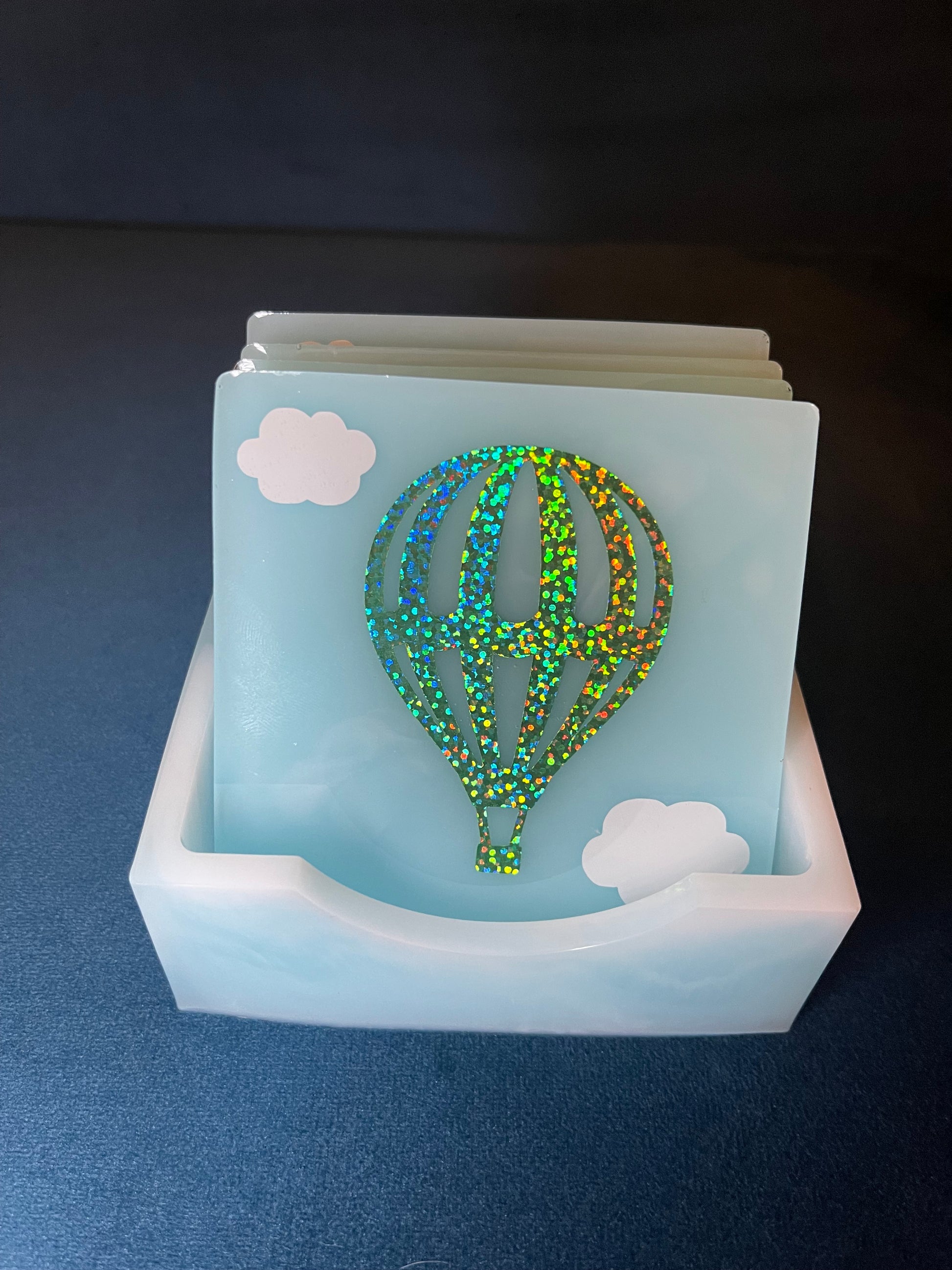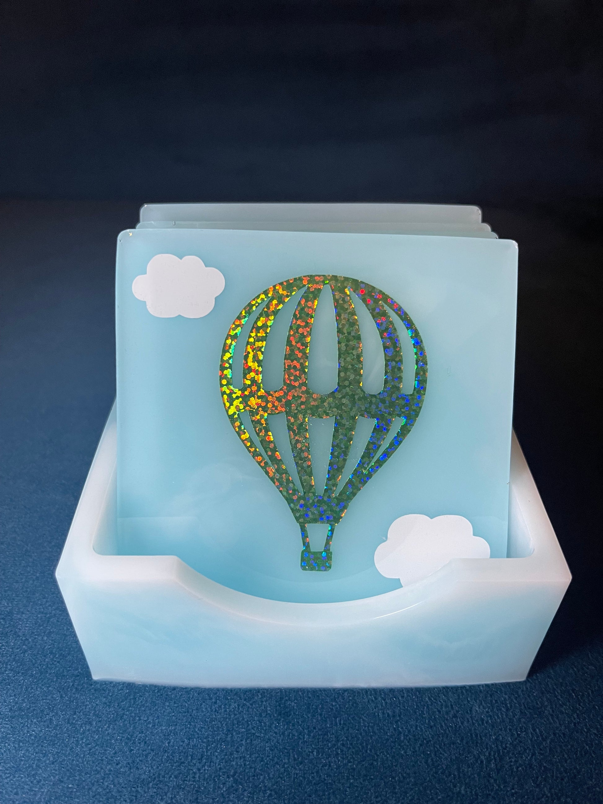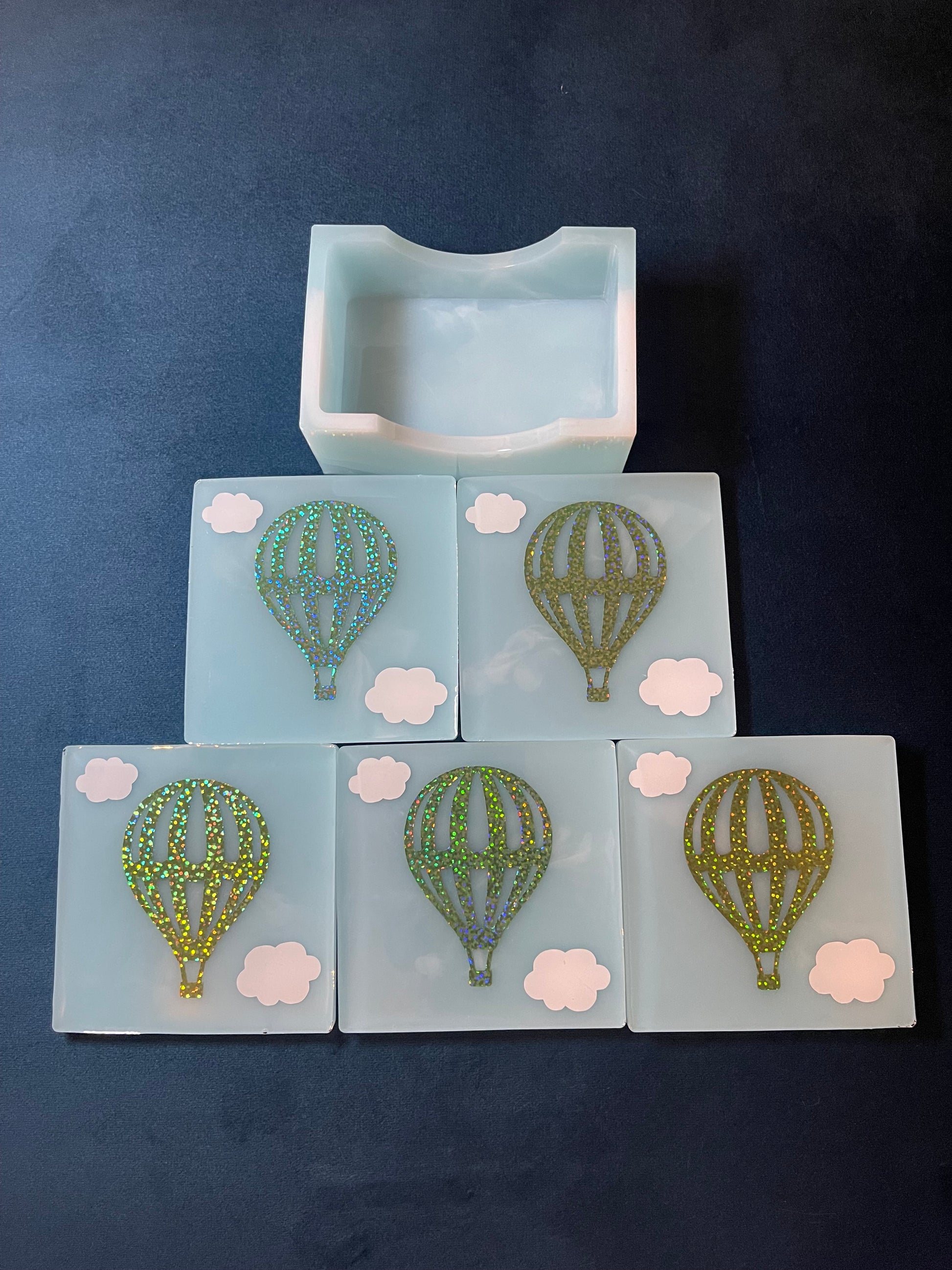 5 gorgeous coasters with a matching tray. Set in sky blue resin, each square coaster features an incredibly sparkly green hot air balloon and two cute white clouds. The set comes with a matching holding tray, featuring the same lovely sky blue with white cloud swirl detail. The sky is the limit with this one-of-a-kind coaster set!