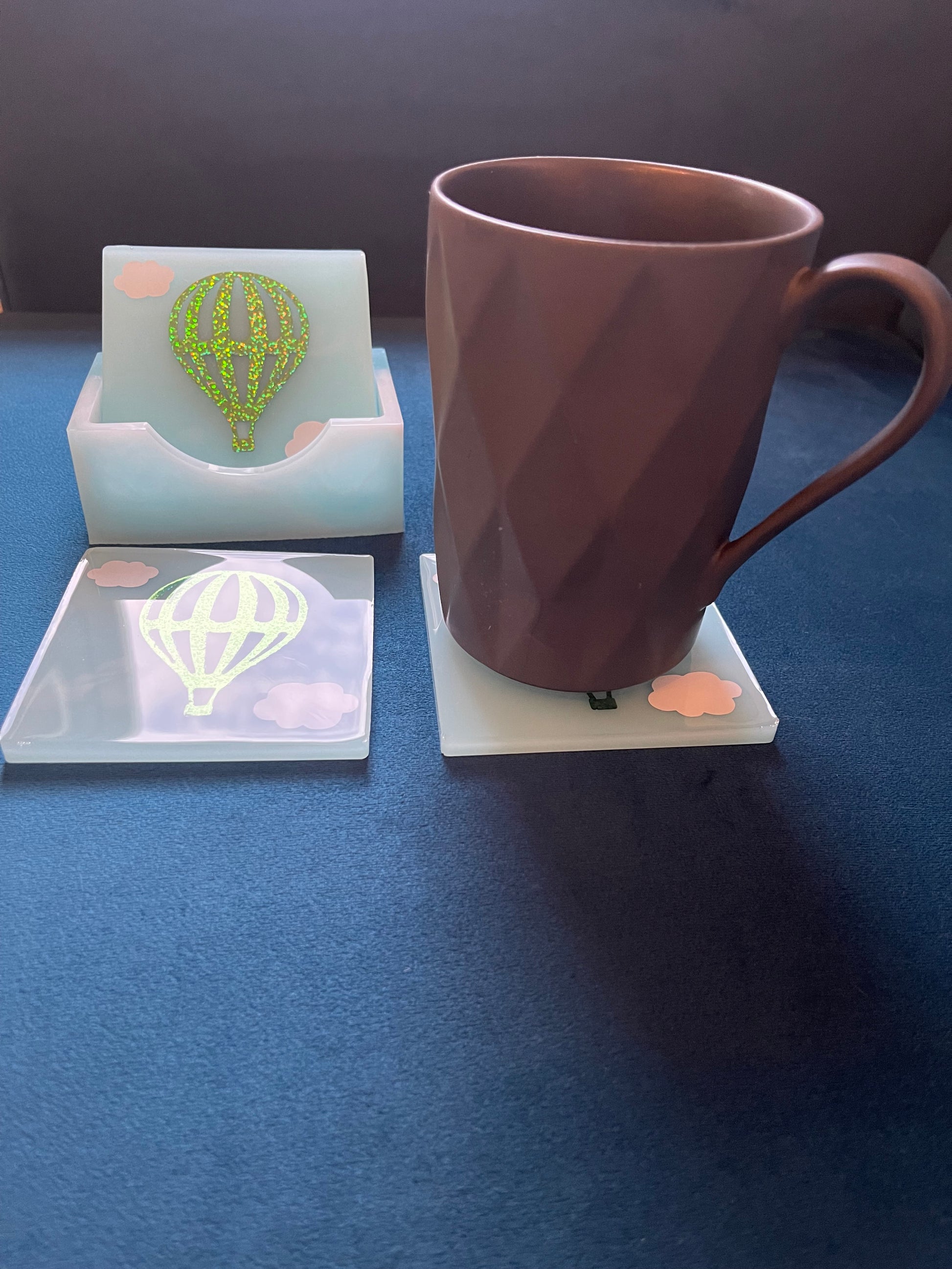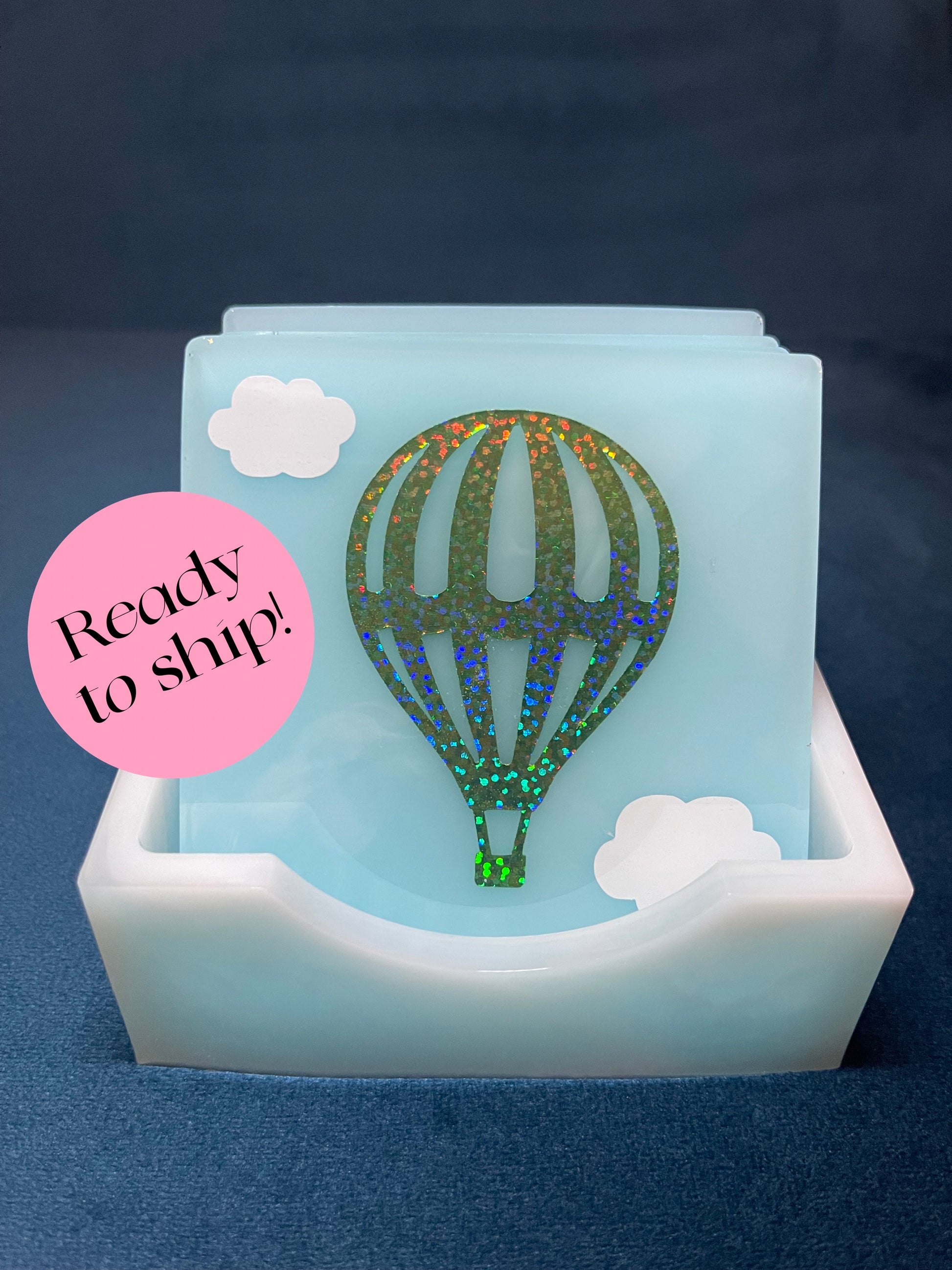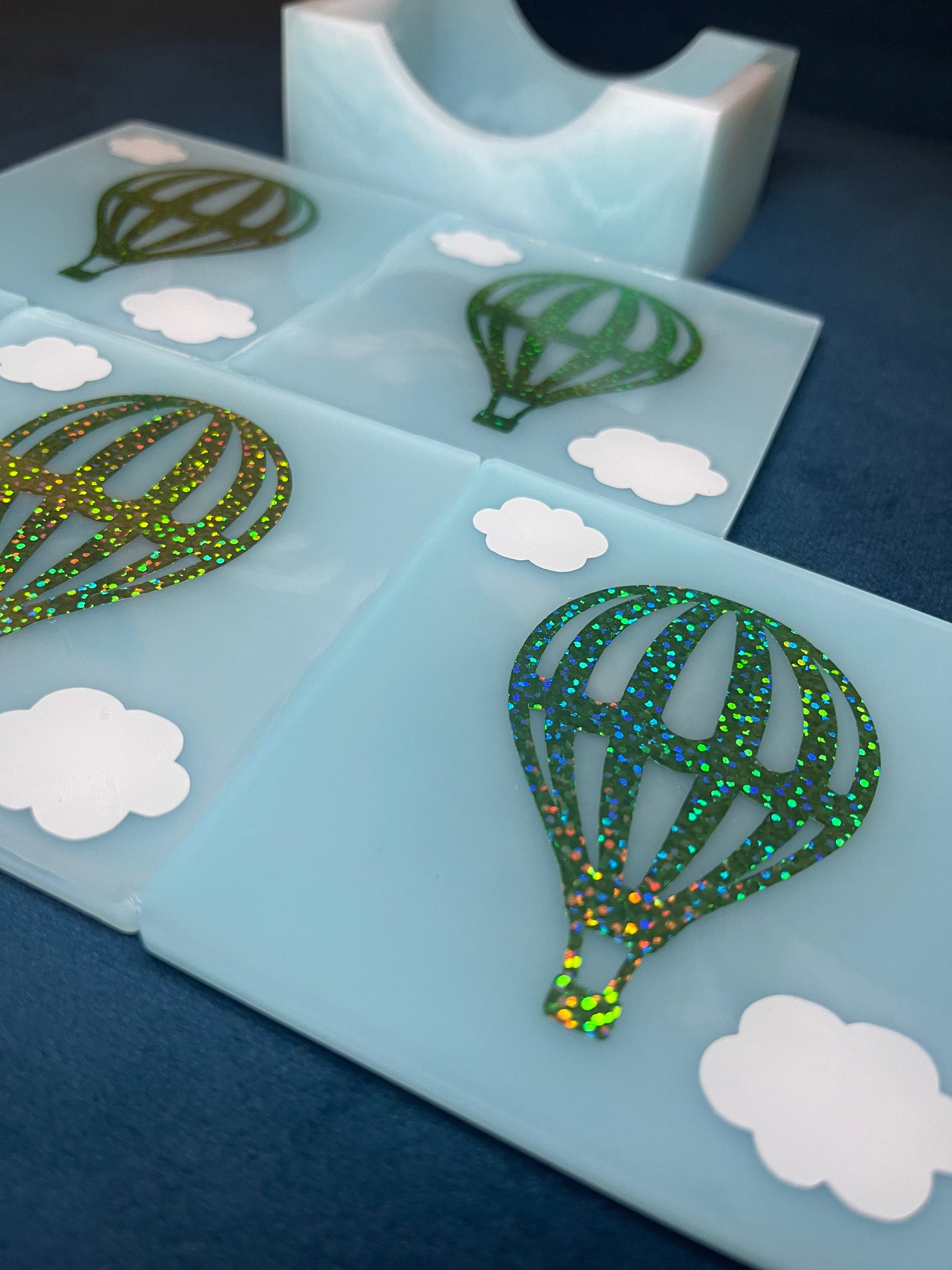 This listing is for a hot air balloon coaster set, but custom orders are available as well! Sets can be customized with resin of any color of the rainbow, a variety of finishes (matte, translucent, shimmer, glitter, pastel, glow in the dark, color shifting), and even unique geometric, floral, space-themed, and various other designs. Please reach out to order your one-of-a-kind set!