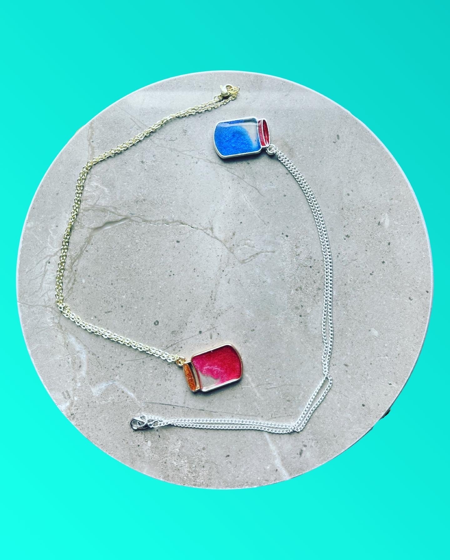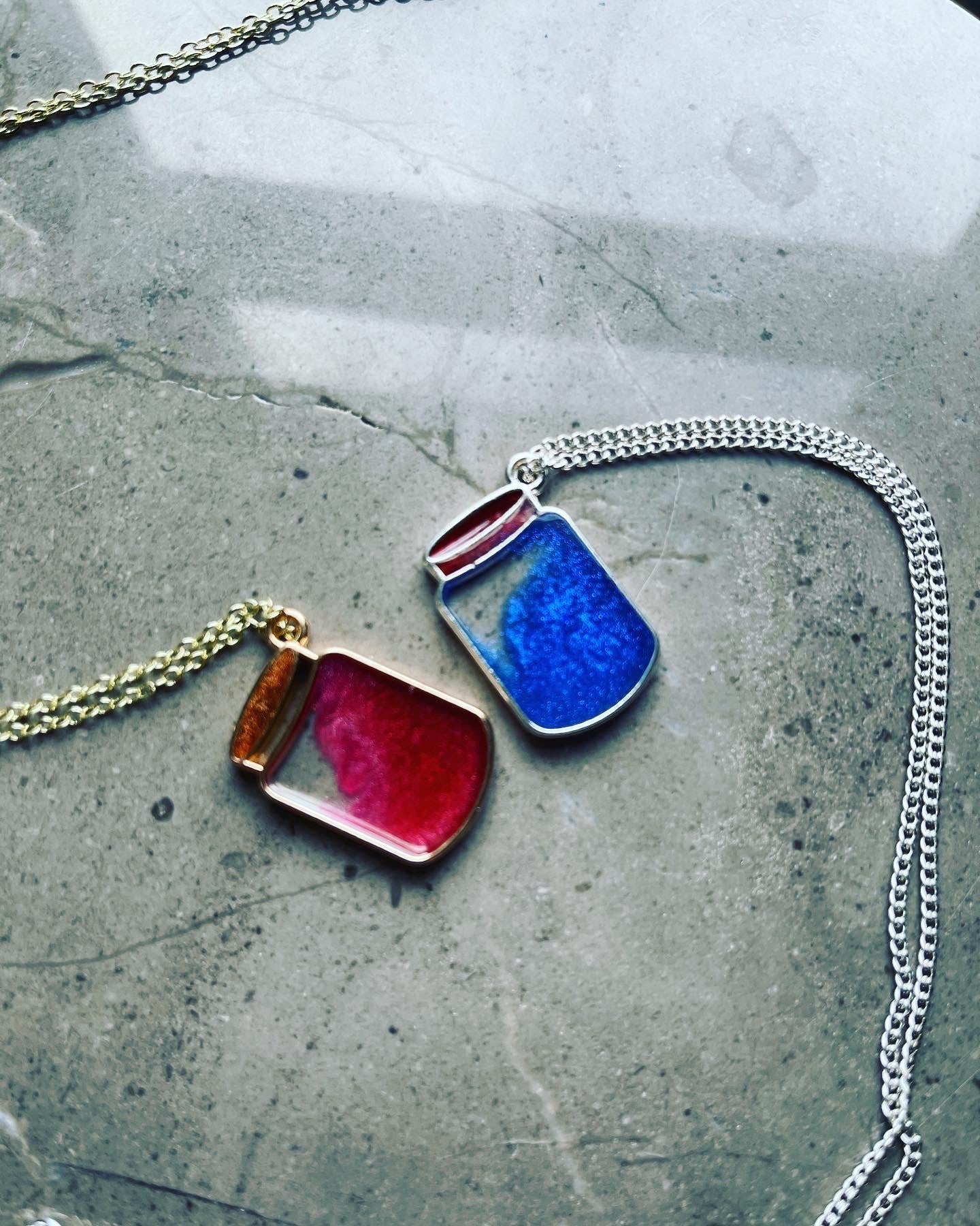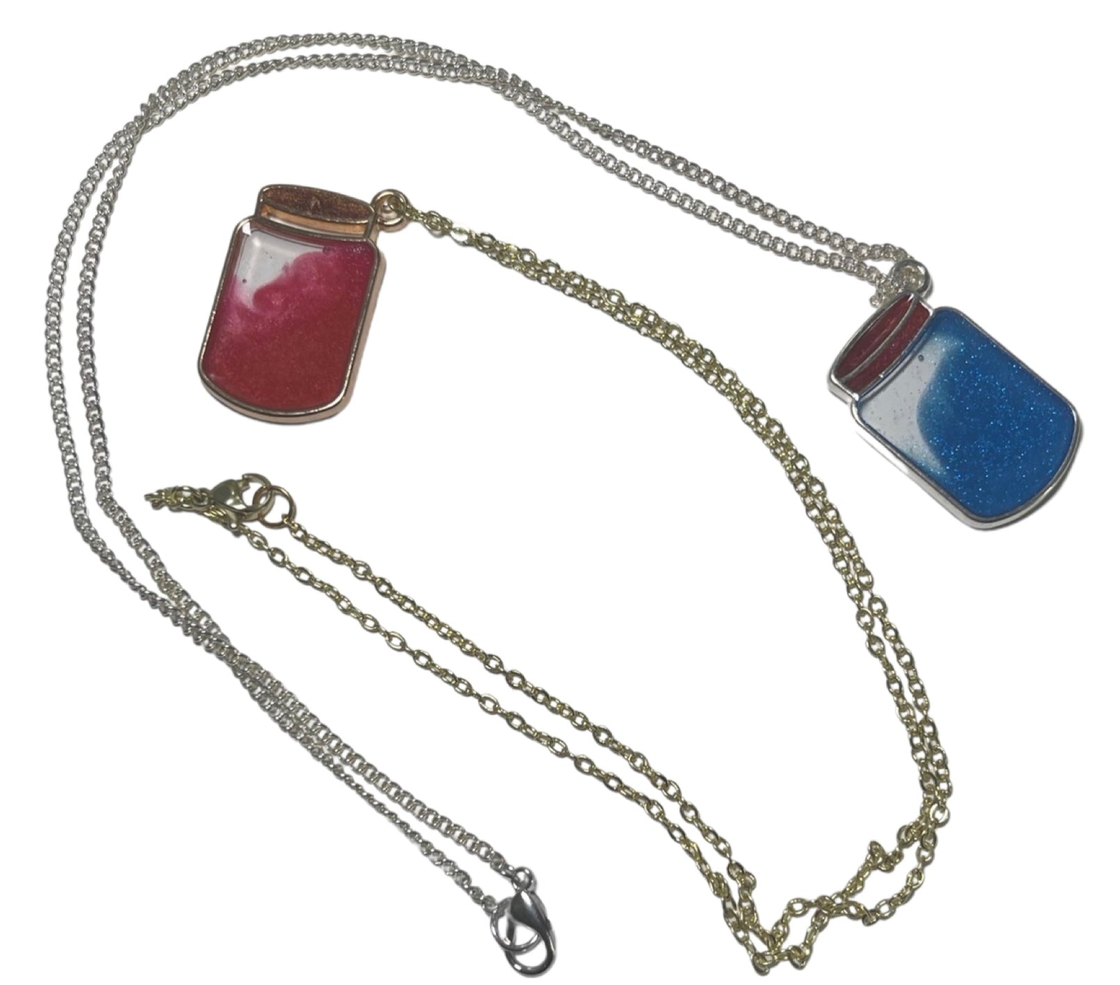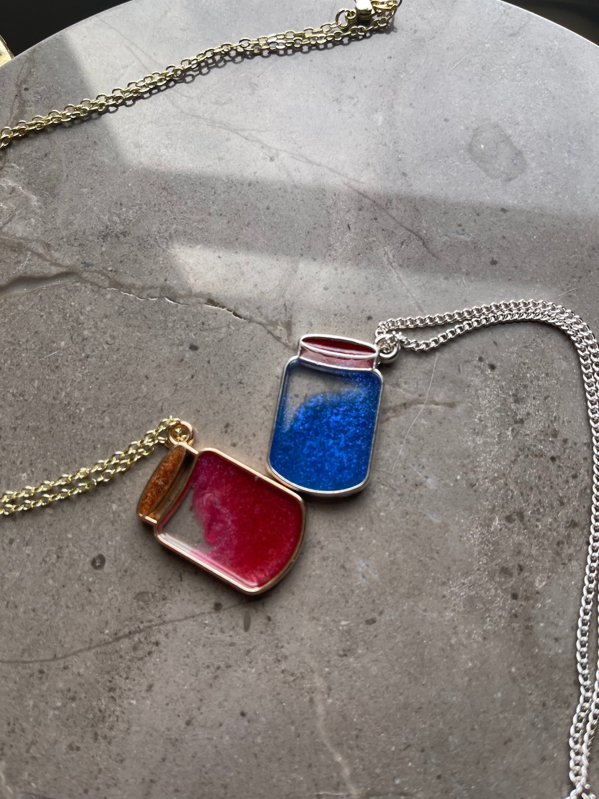 The jar pendant measures approximately 1.15 inches in height and .75 inches in width. The necklace chain is approximately 18 inches in length. Handmade with resin and love.