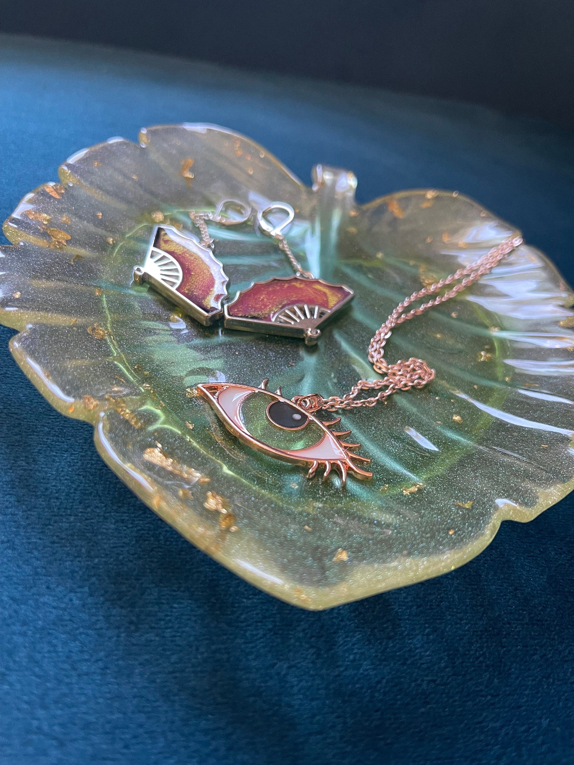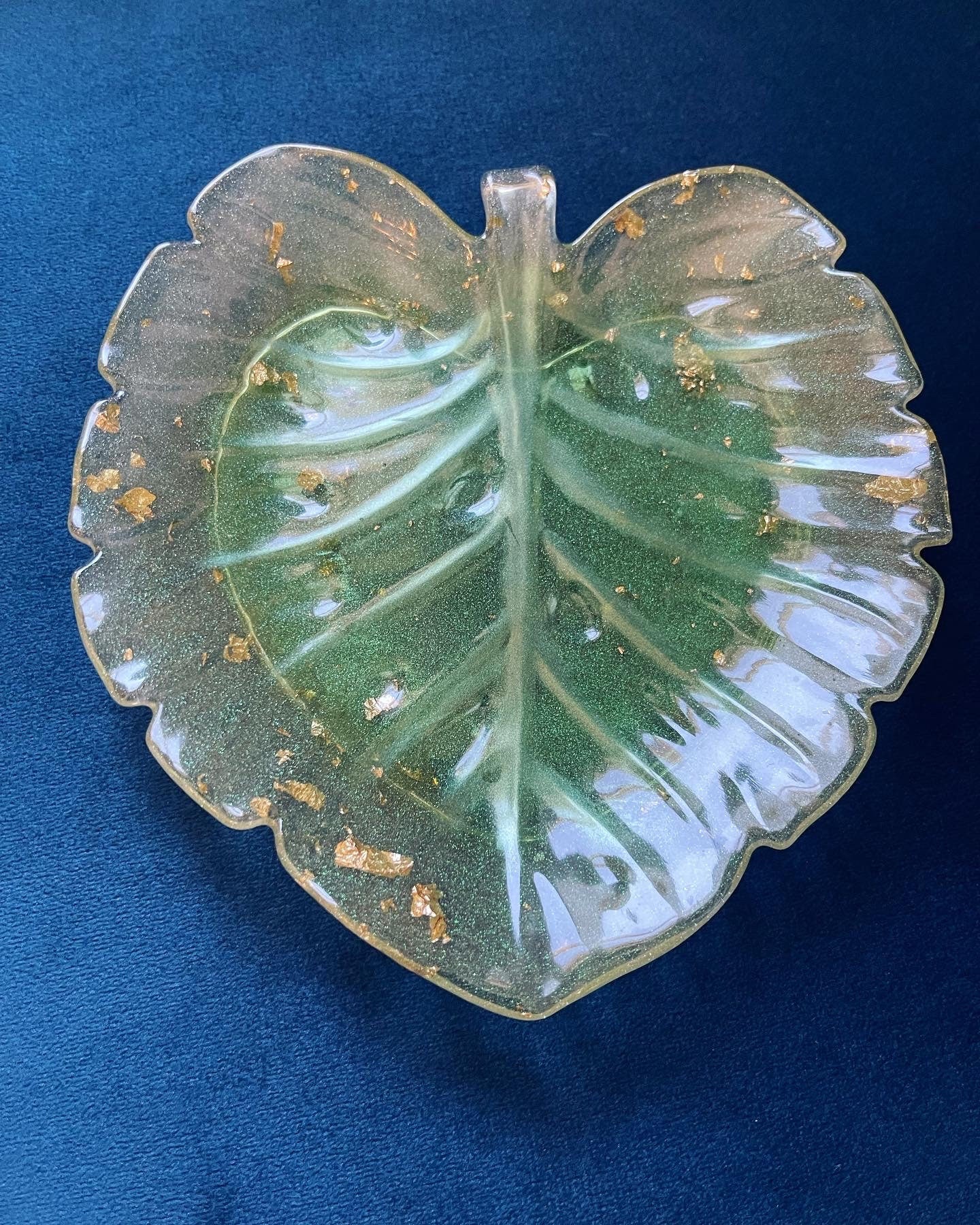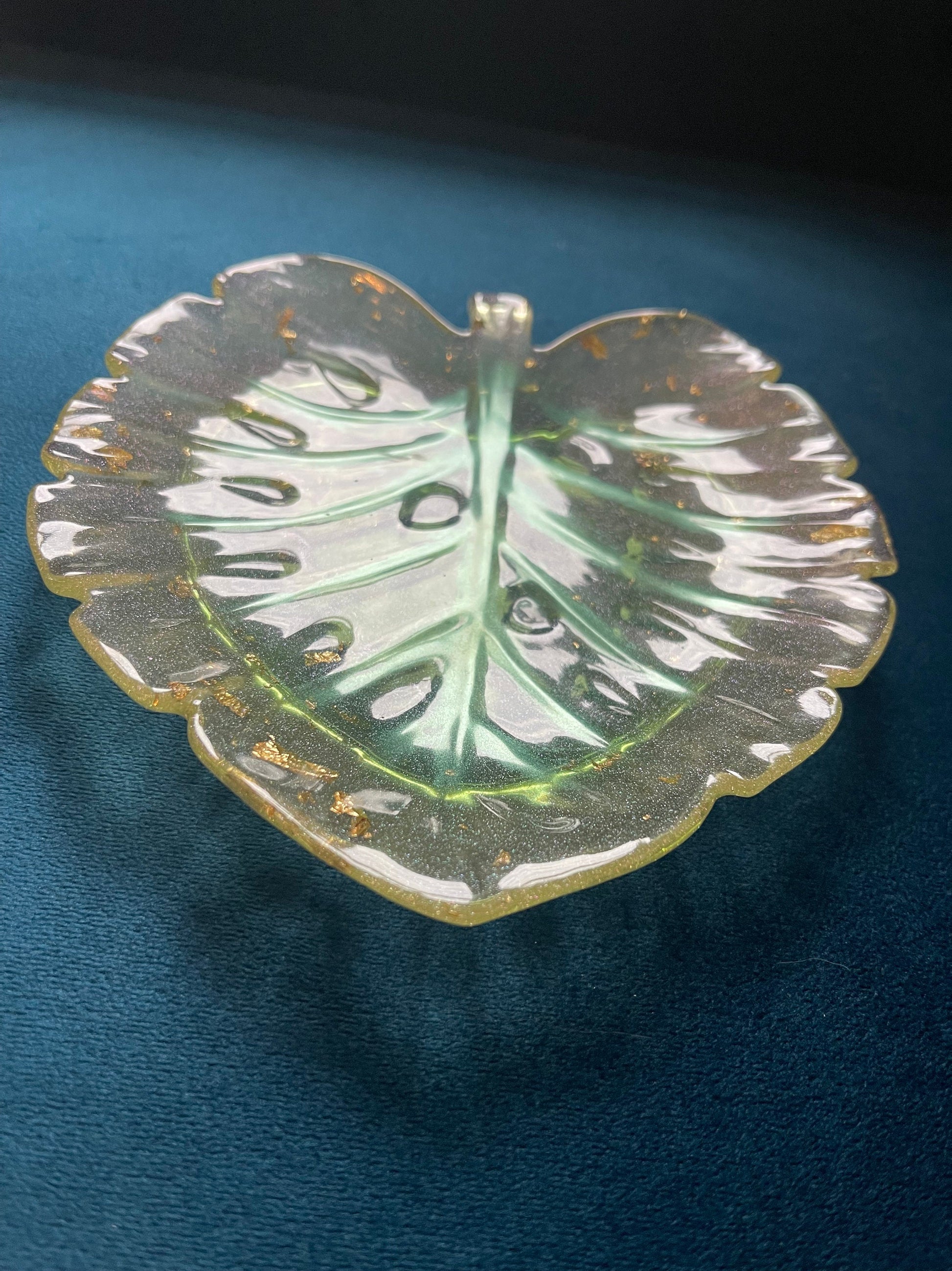 A strikingly beautiful resin monstera leaf tray! This tray features delicate details and a sturdy base, this tray is perfect for just about everything. Use it as a jewelry tray, a key dish, it's even food safe! Add a terrific tropical touch to your home with a monstera leaf tray customized especially for you.