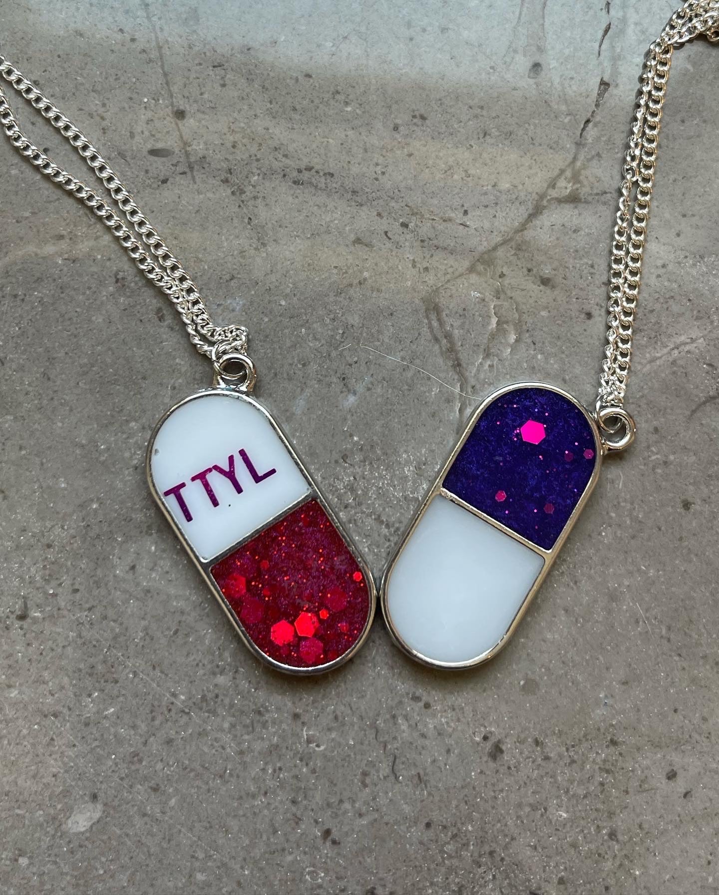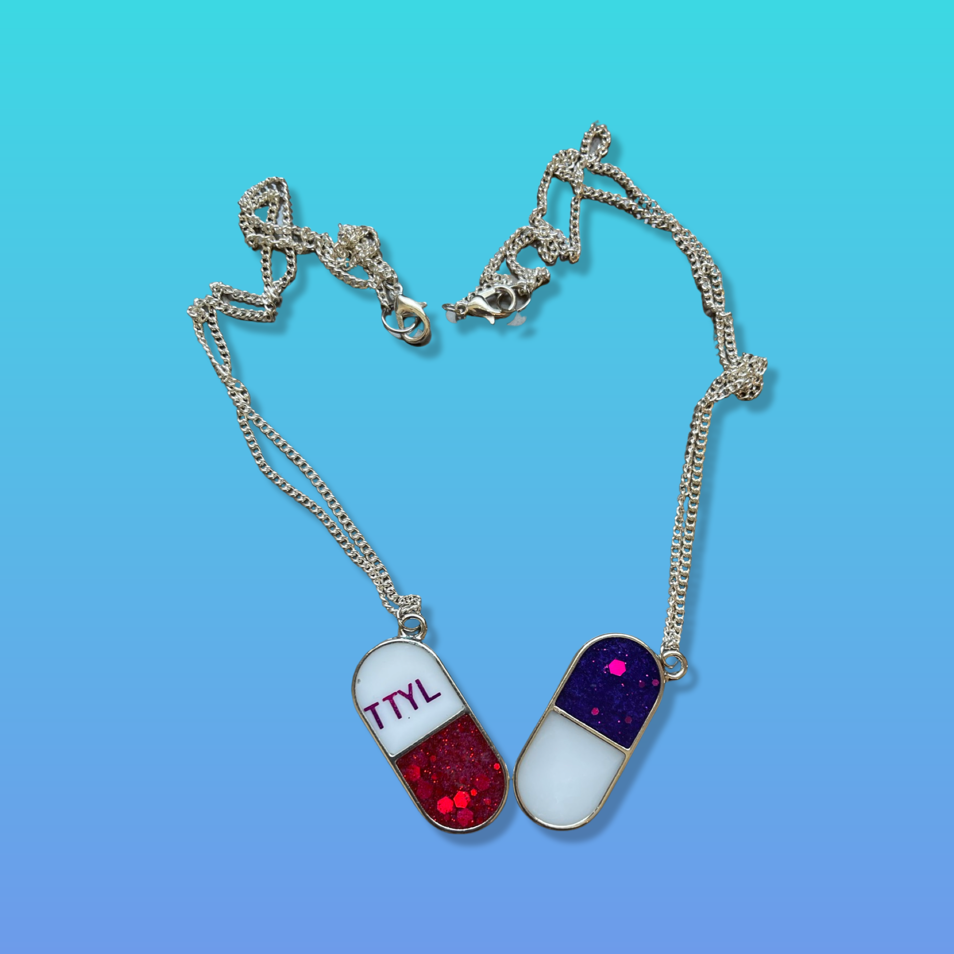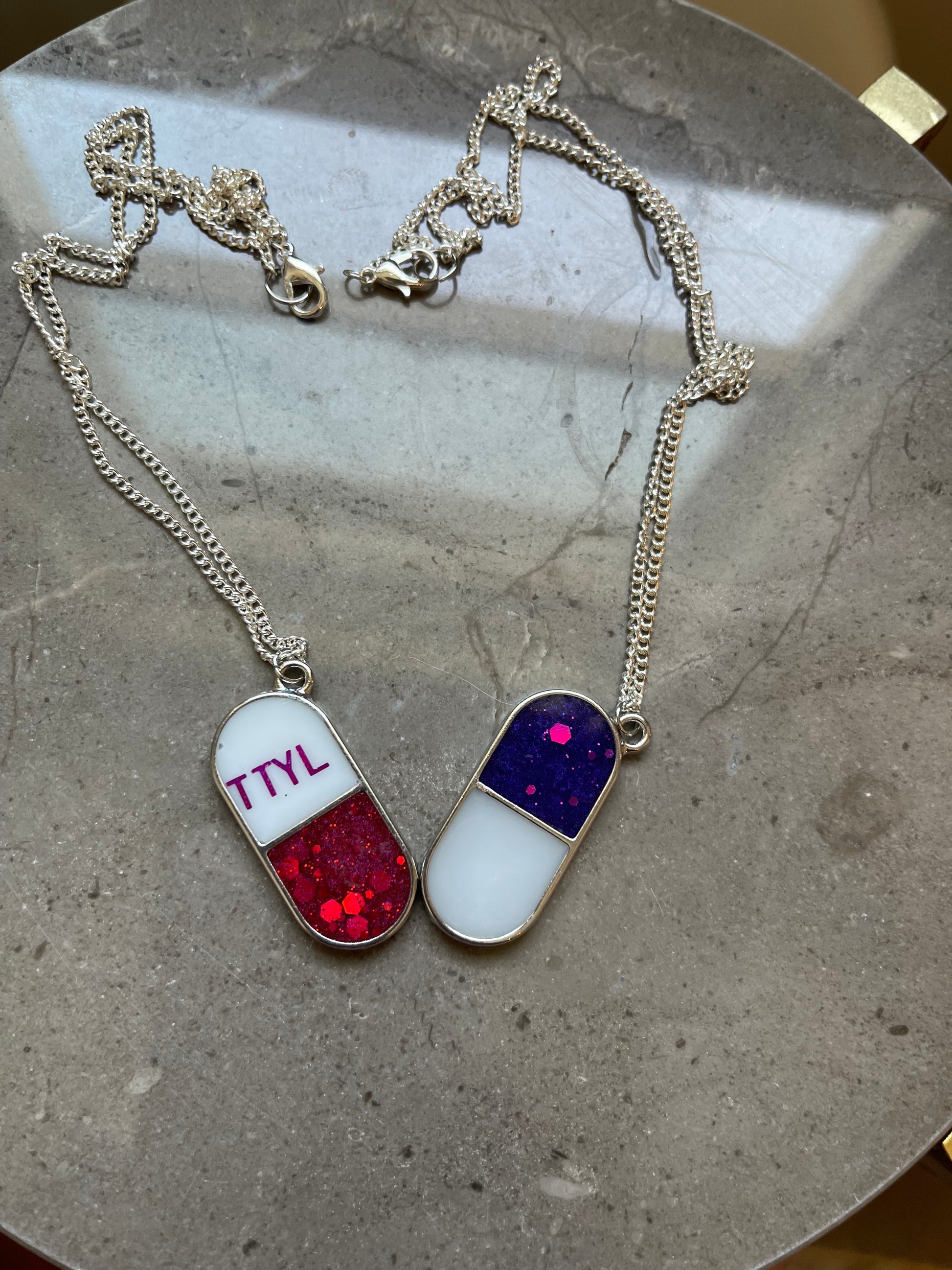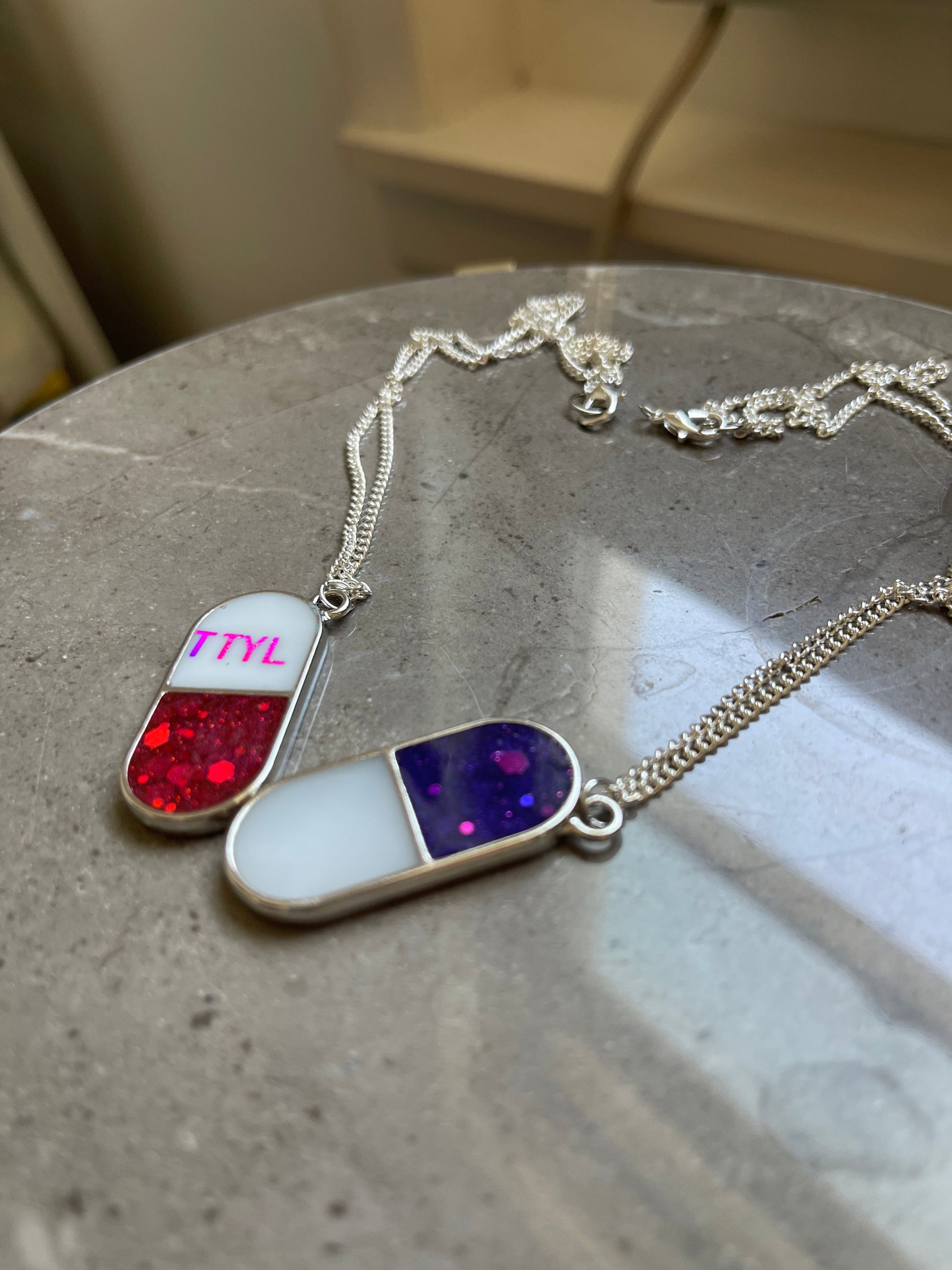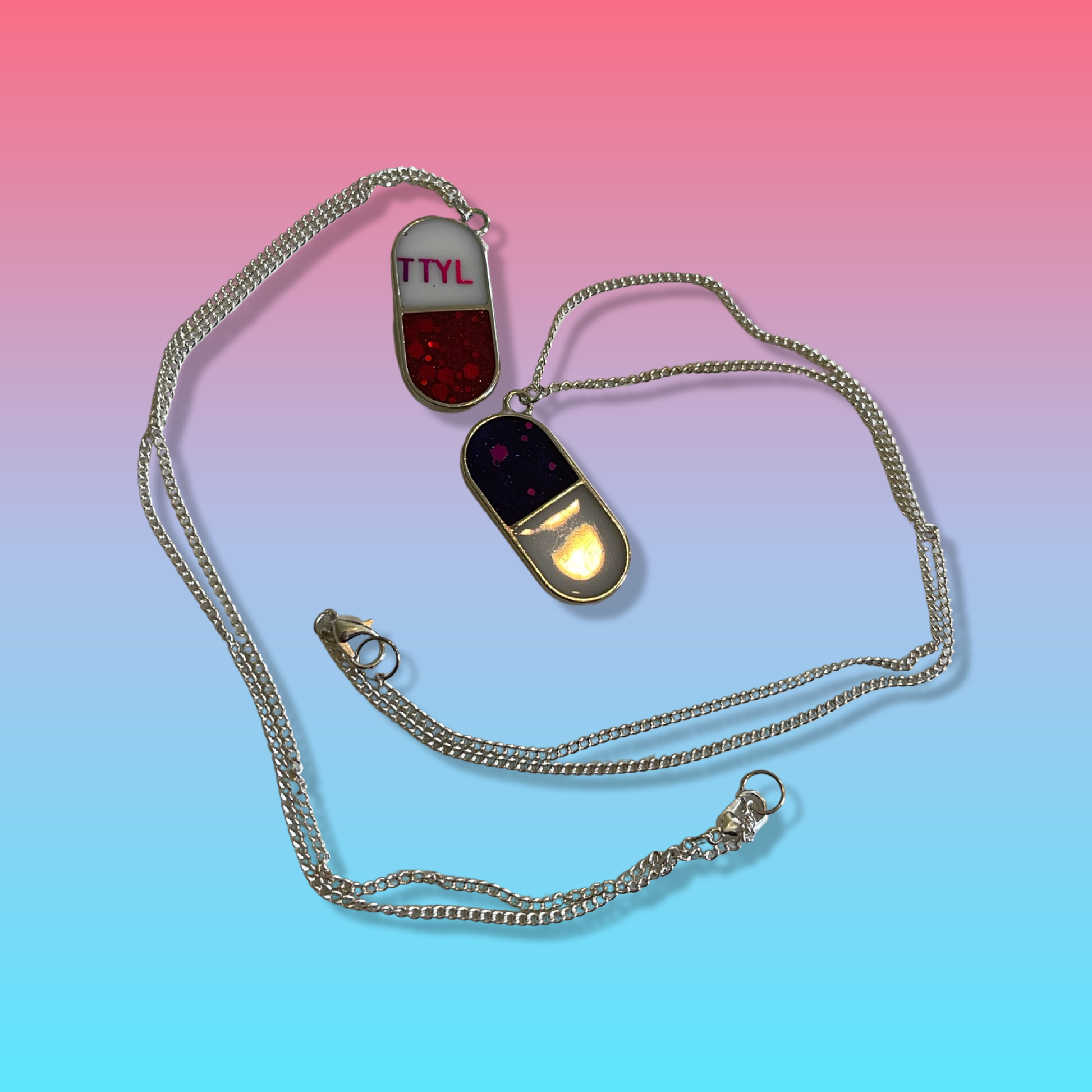 The pill pendant measures approximately 1.5 inches in height and .75 inches in width. The necklace chain is approximately 18 inches in length. Handmade with resin and love.