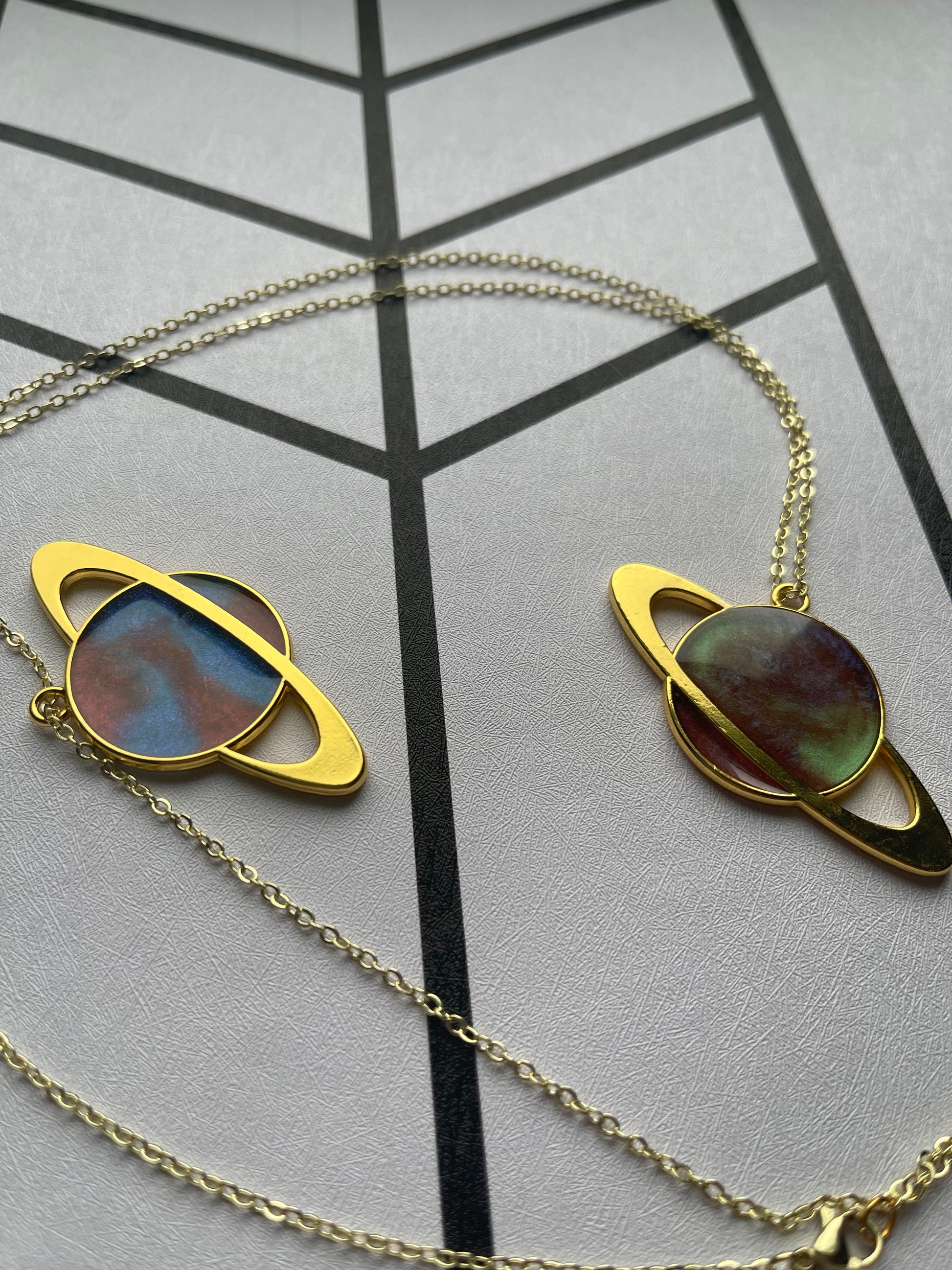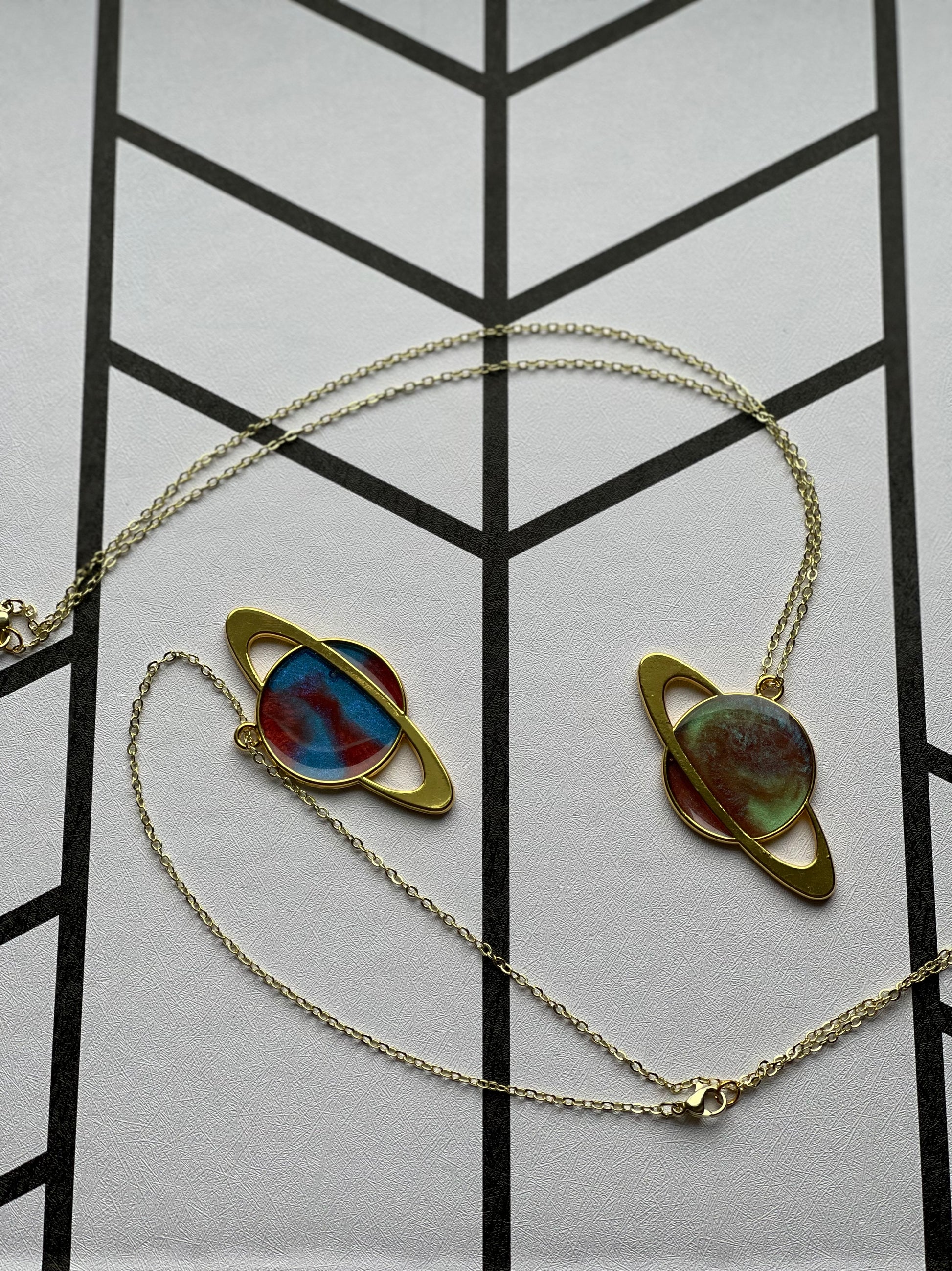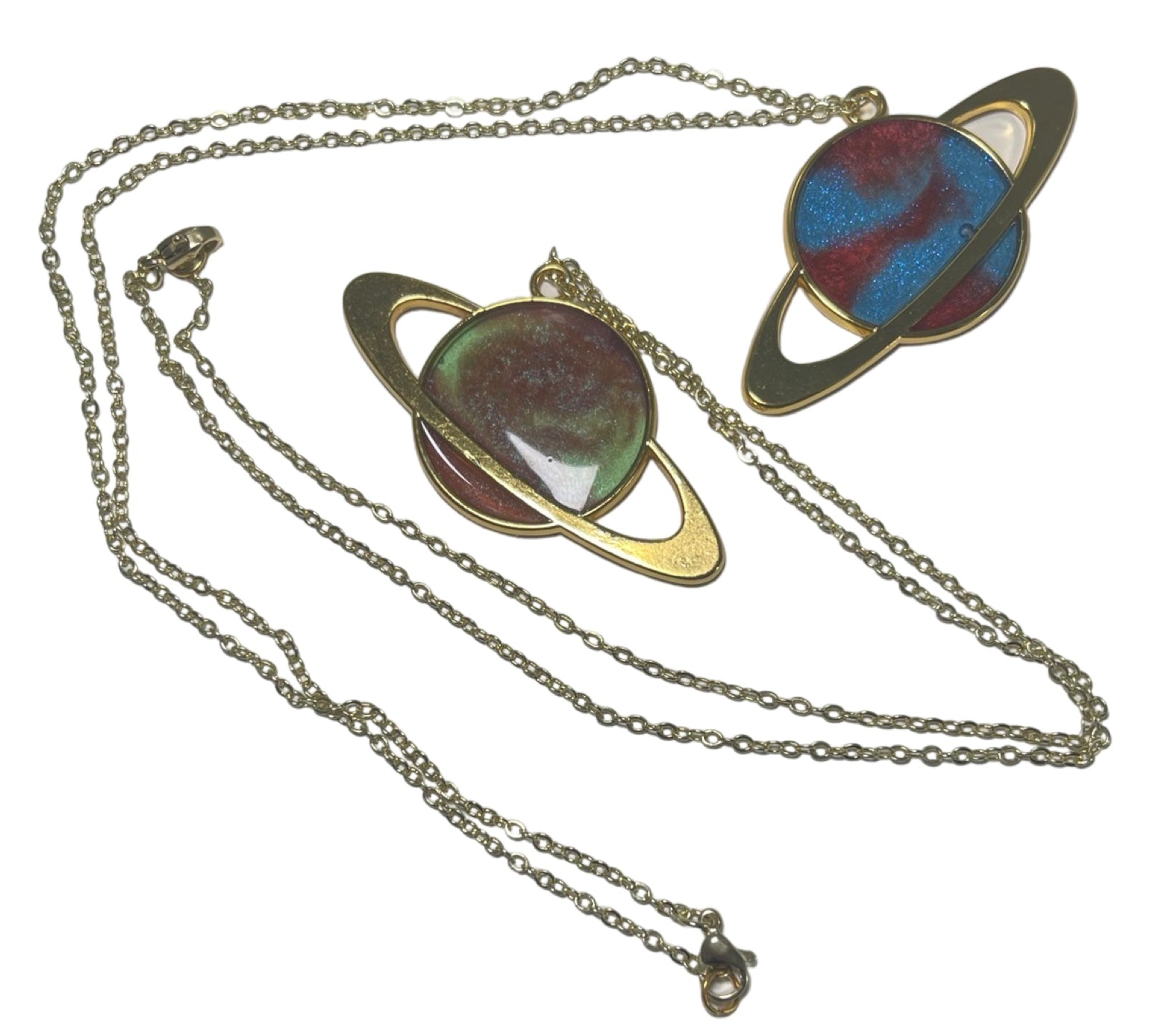 A beautiful resin necklace that is absolutely out of this world! A gorgeous gold ring orbits around a planet of swirling resin, all on a delicate chain. Be the extraplanetary explorer of your dreams with this custom, handmade piece!