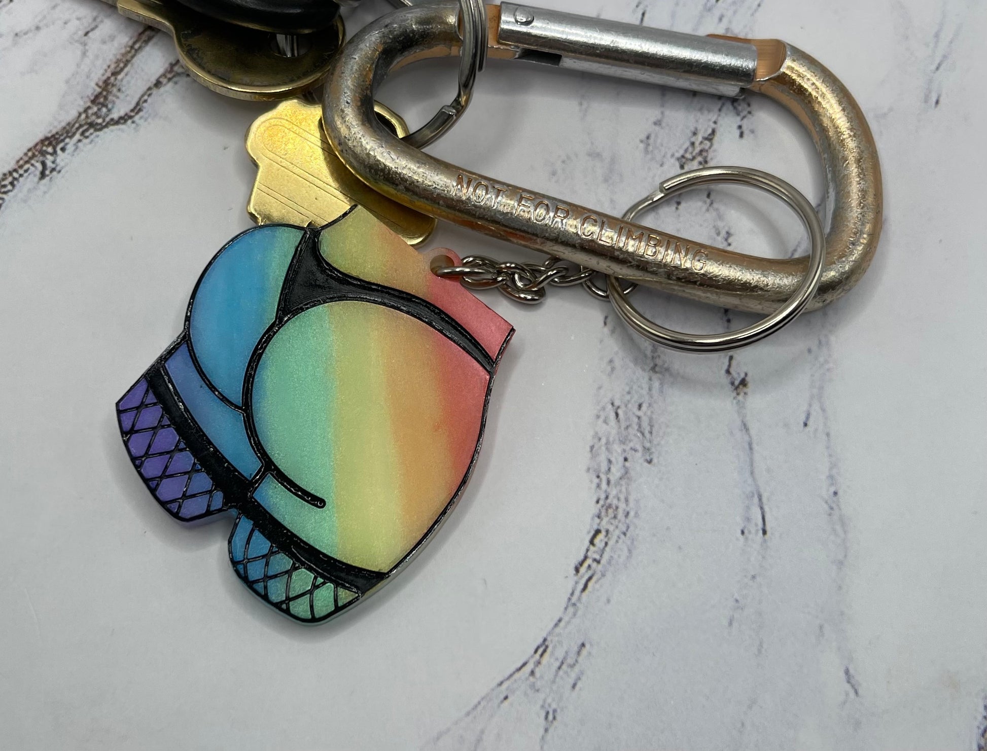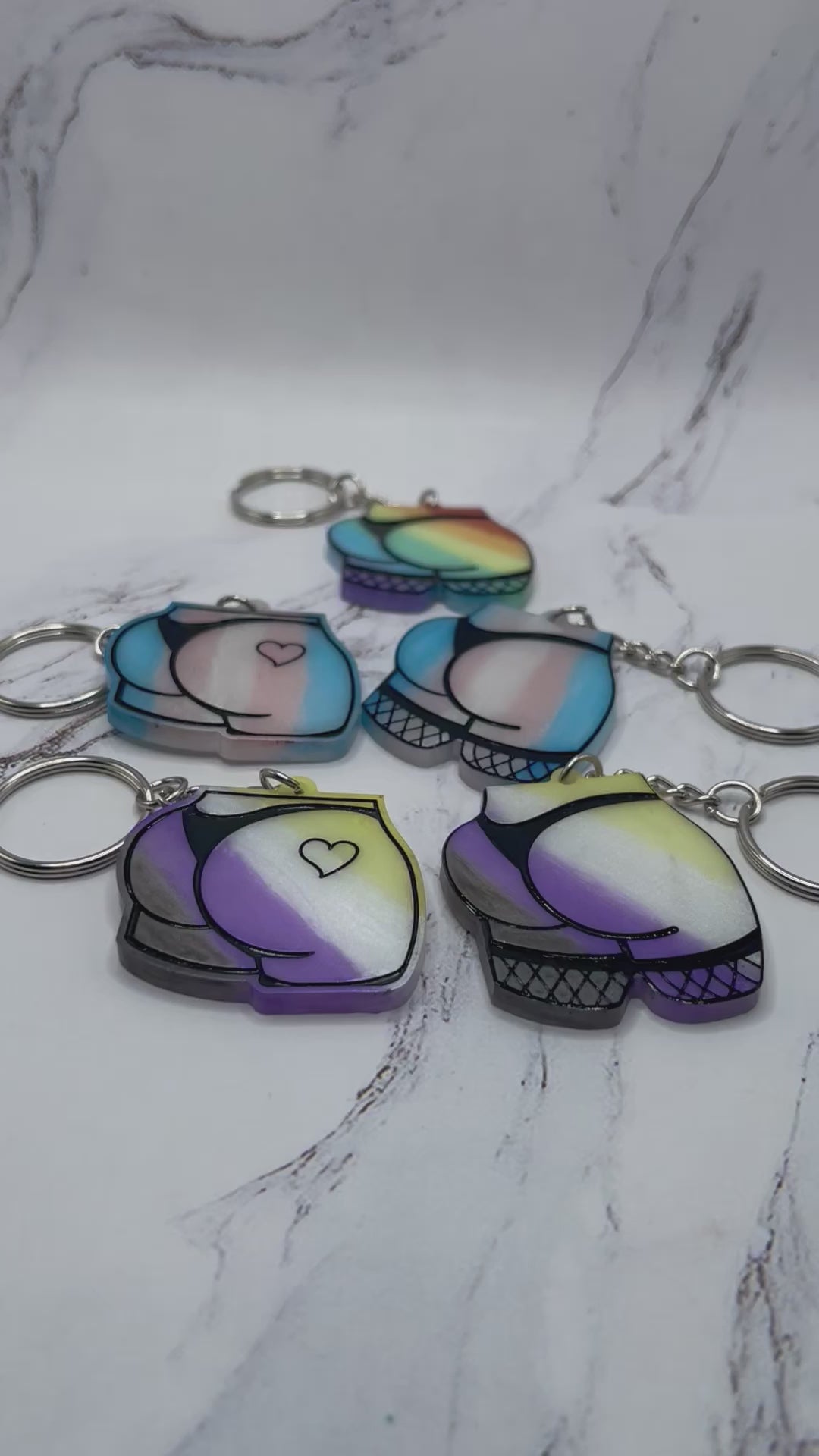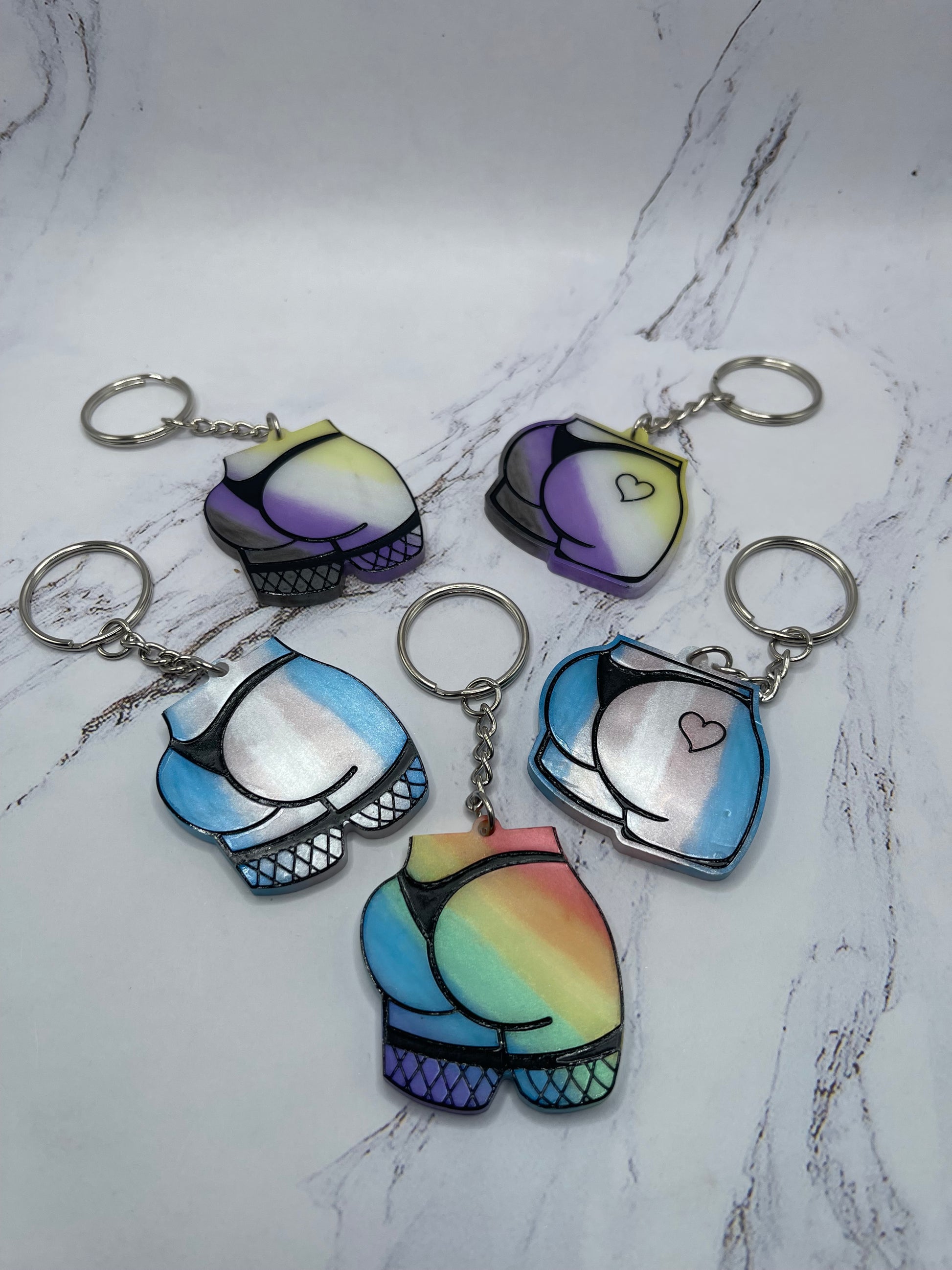 The most bootylicious resin keychain you've ever laid eyes on! These cheeky little accessories feature a sexy booty in your choice of pride flag design. With provocative accents like fishnets or a heart, make a statement every time leave the house!