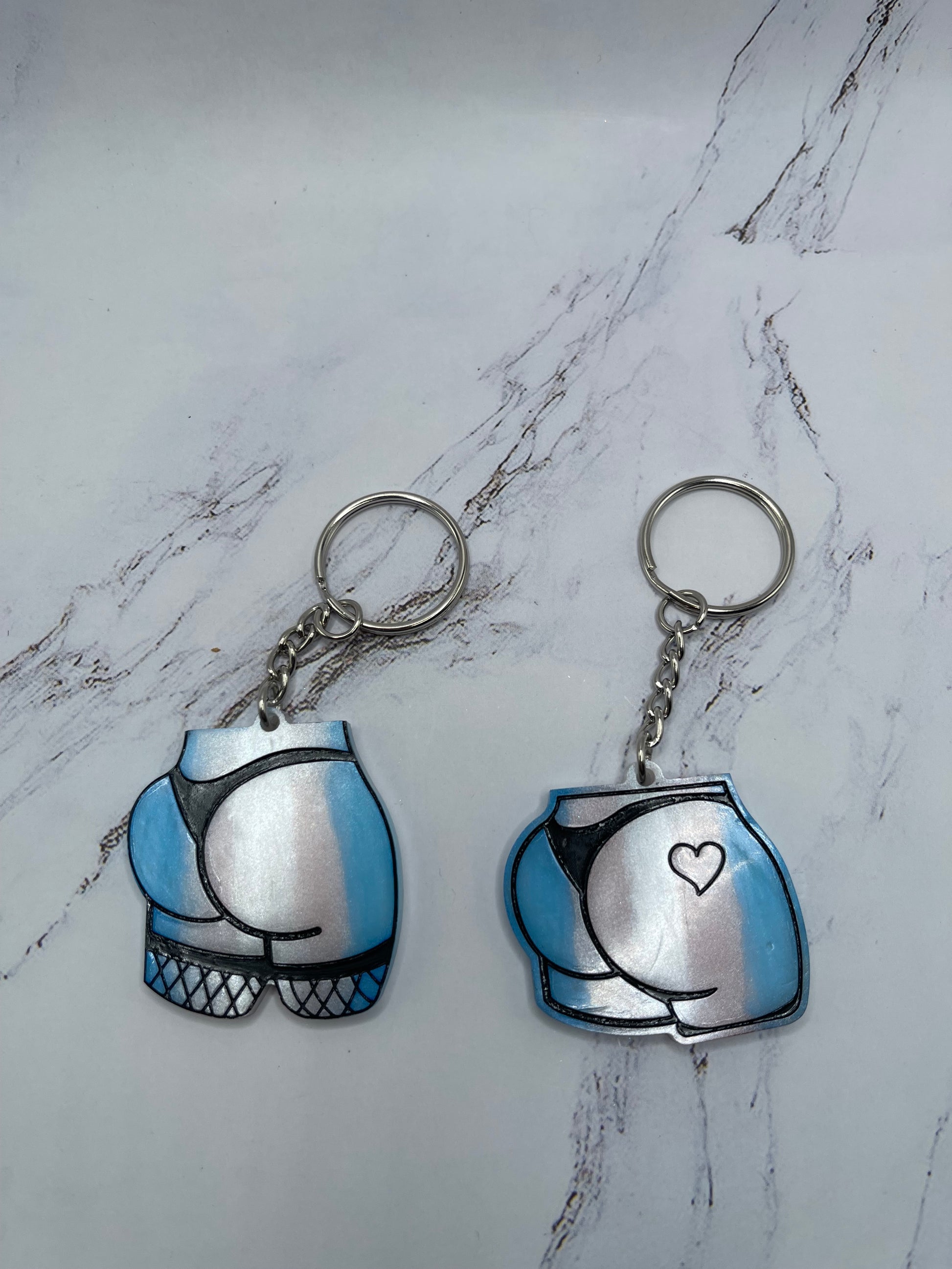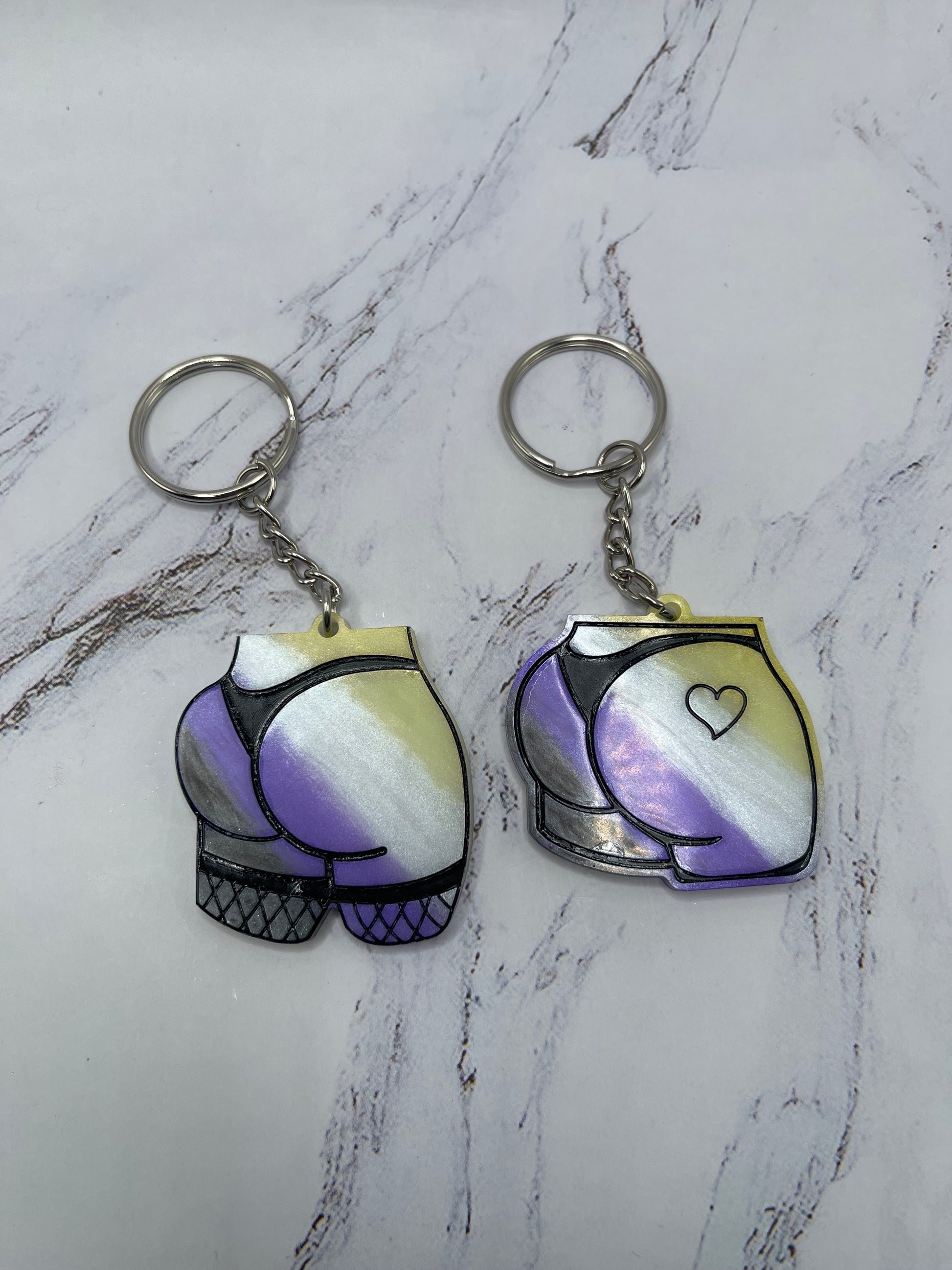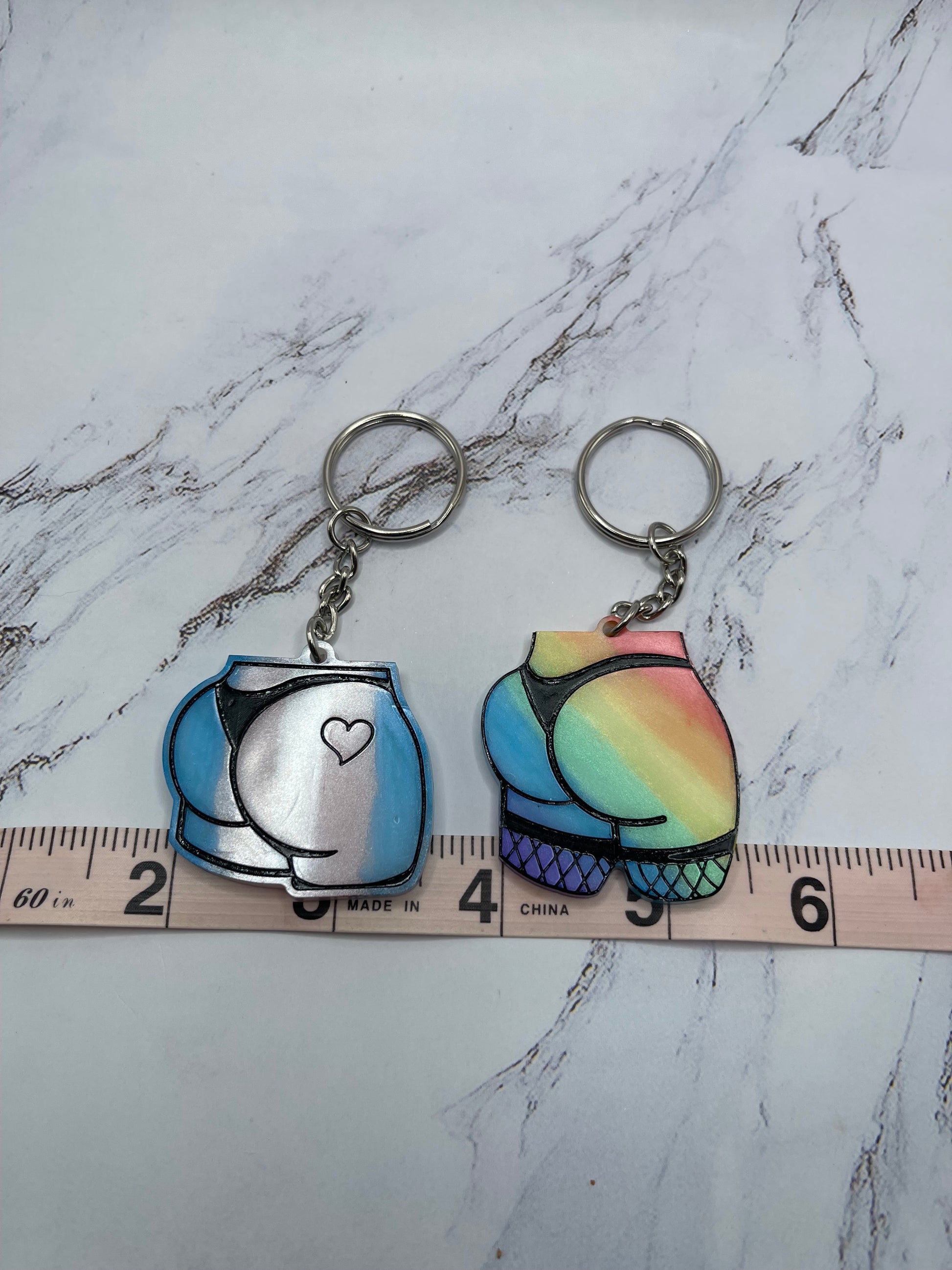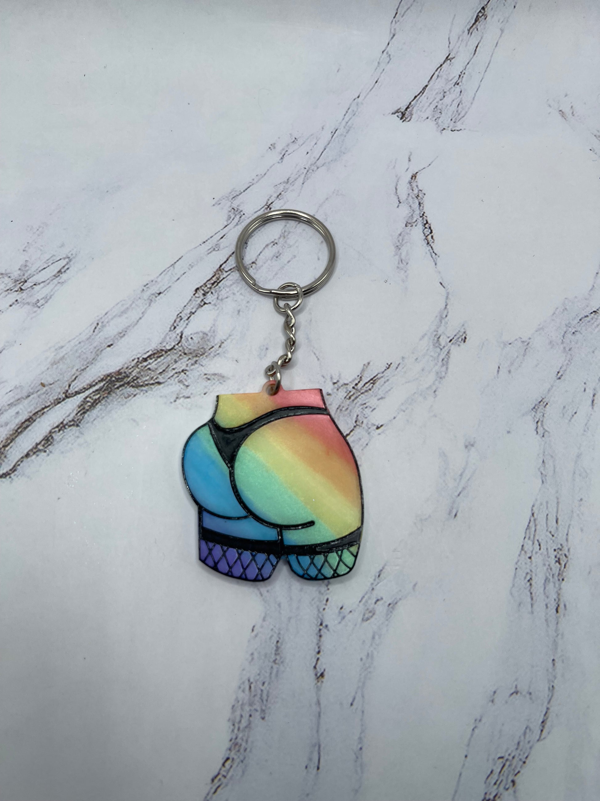 The most bootylicious resin keychain you've ever laid eyes on! These cheeky little accessories feature a sexy booty in your choice of pride flag design. With provocative accents like fishnets or a heart, make a statement every time leave the house!
