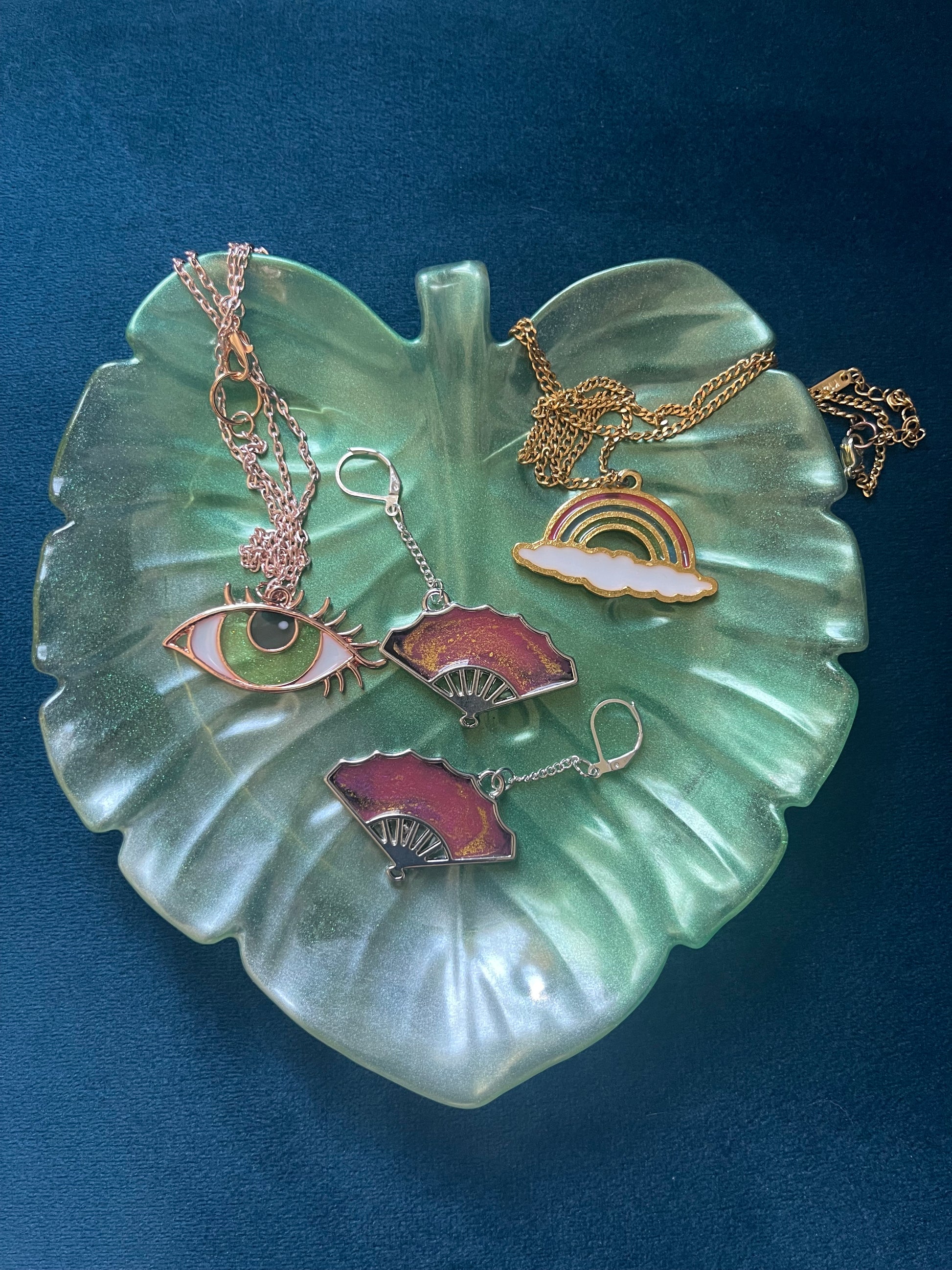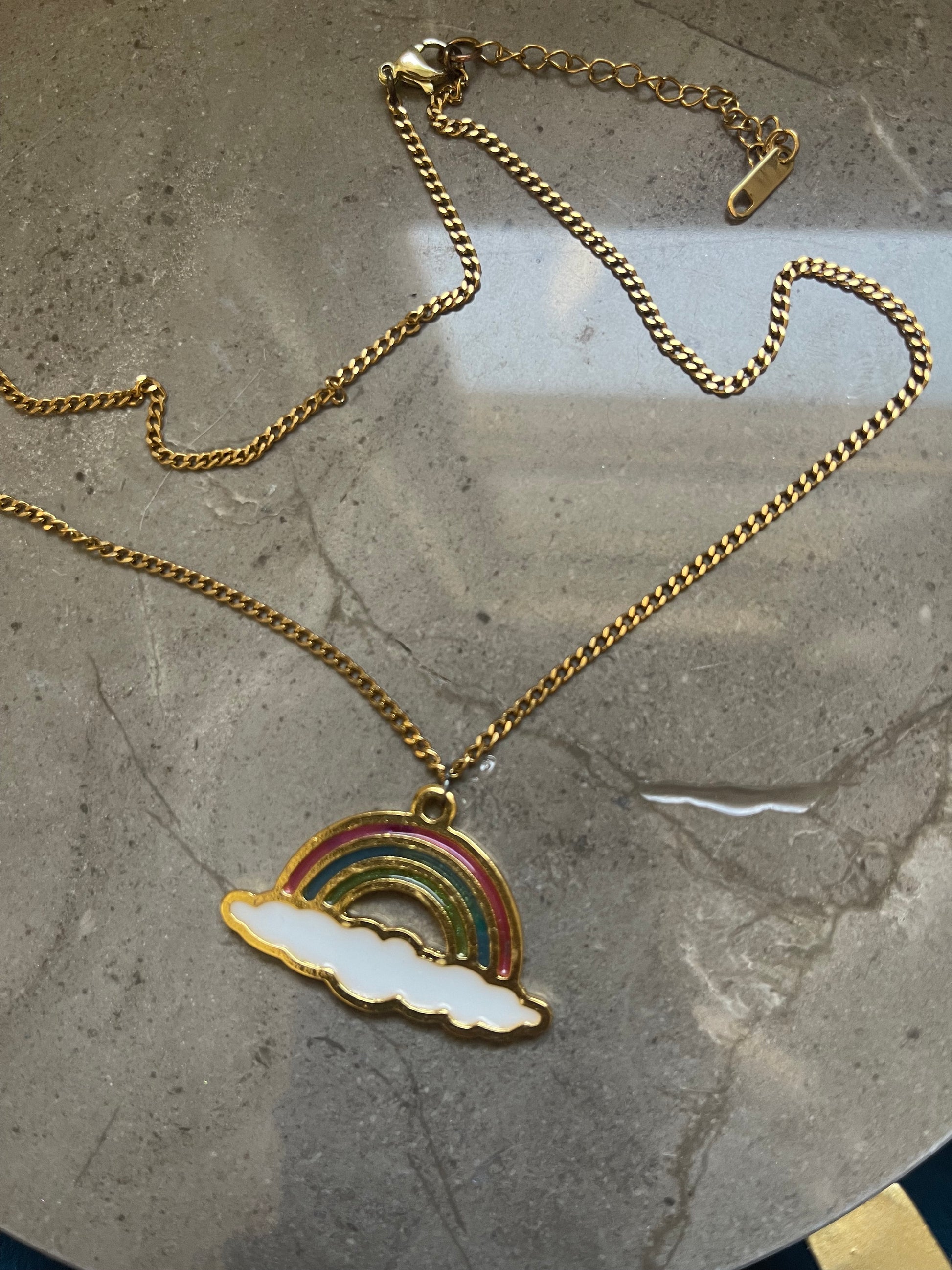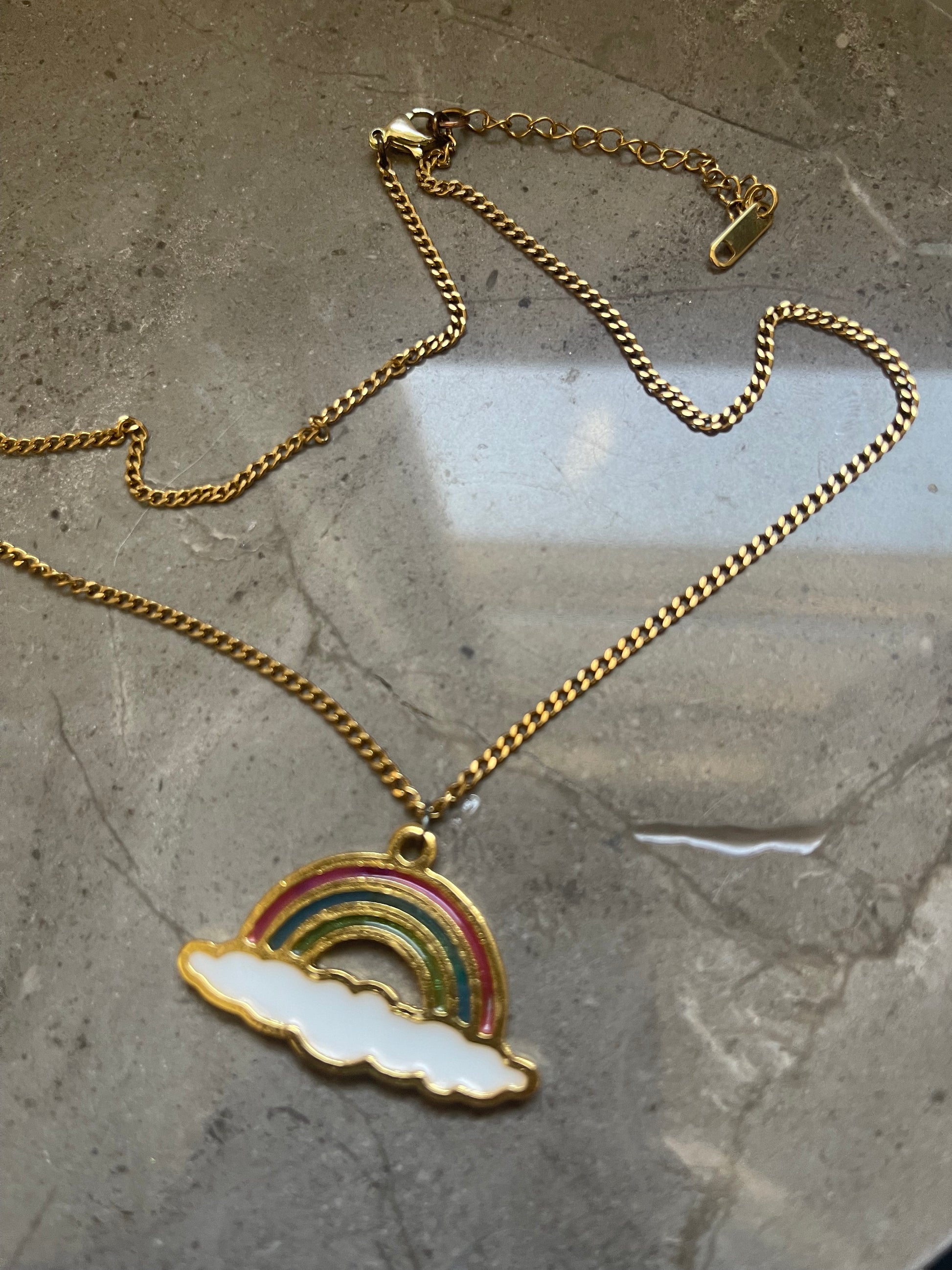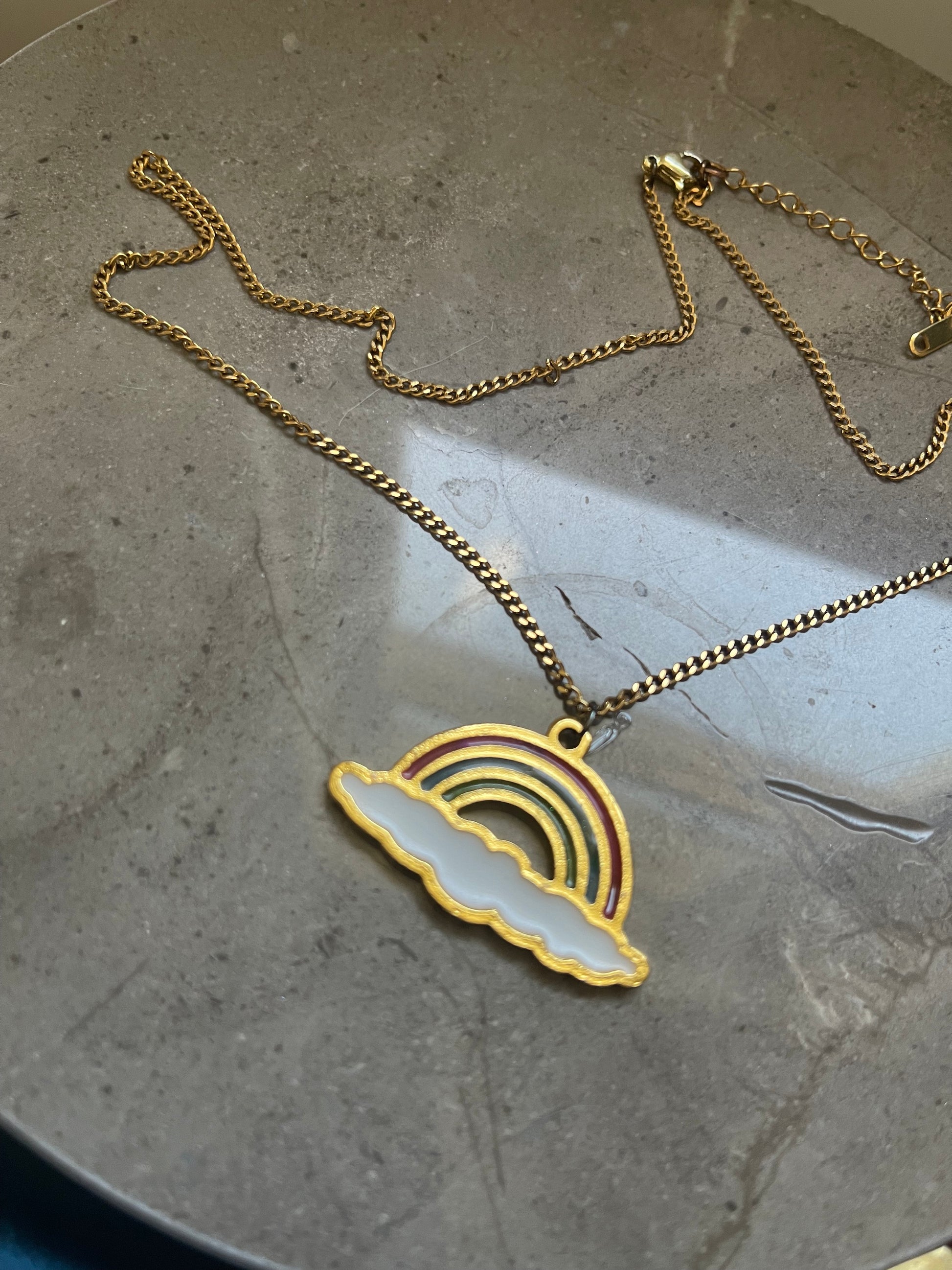 A beautiful resin necklace that will send you over the rainbow 🌈 This handmade resin necklace features three arcs of gorgeous color over a pure white cloud, set in a gold-colored bezel. A lovely pop of color for any outfit, this necklace is ready to be worn!