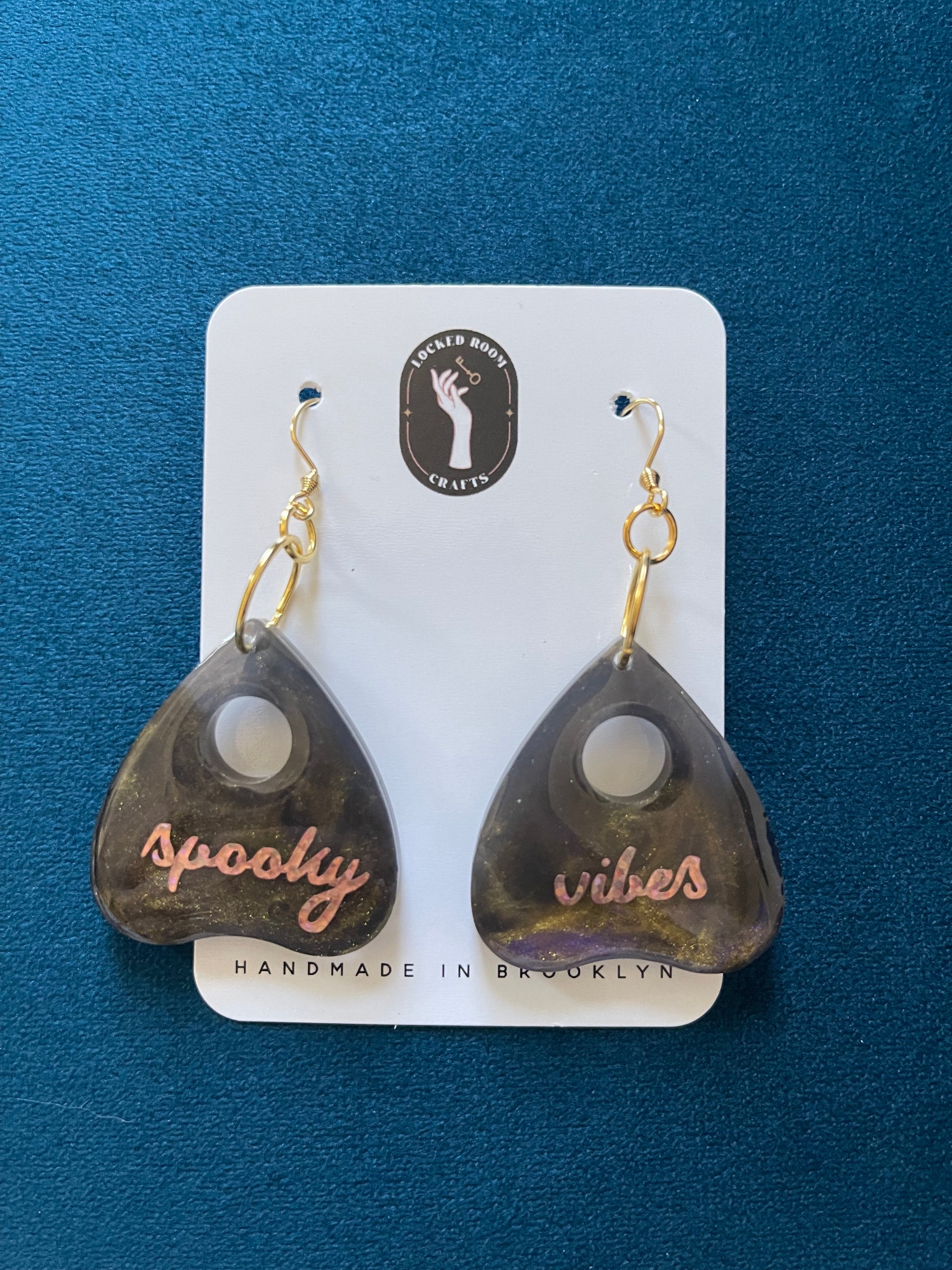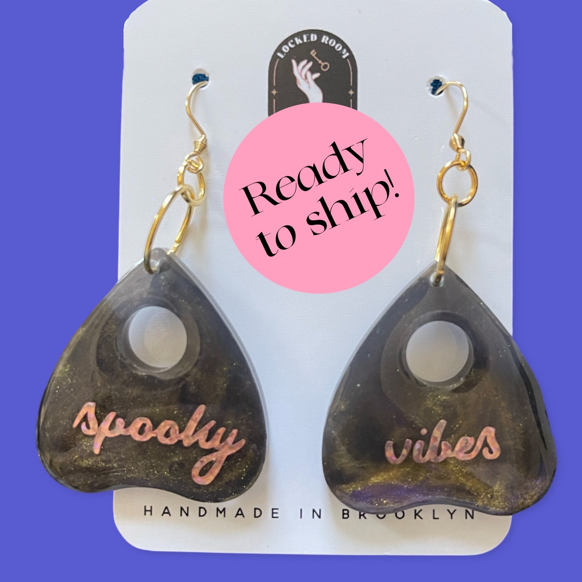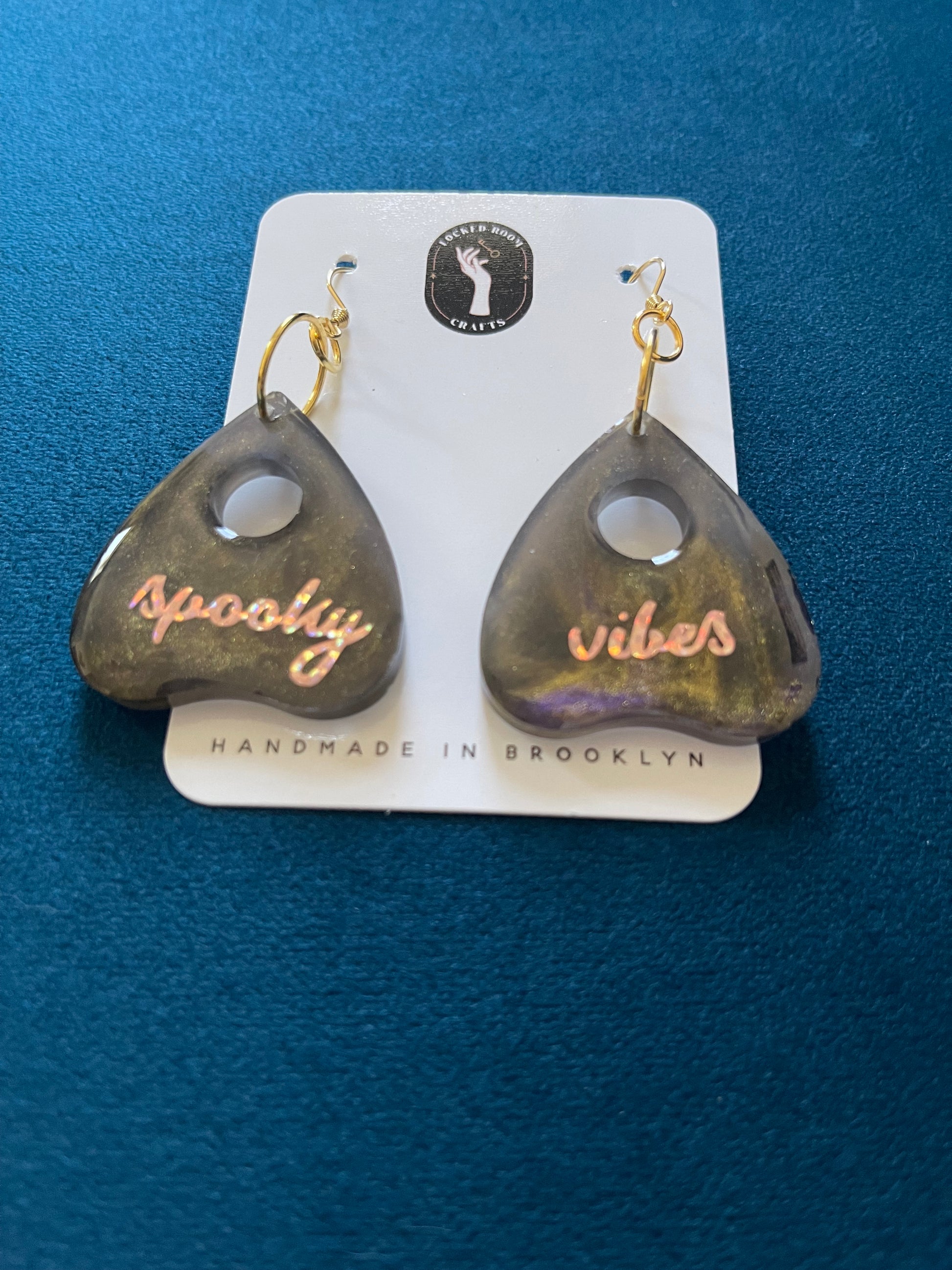 A beguilingly beautiful pair of planchette earrings, perfect to usher in the spooky season! Hand poured with resin swirling in purple, black, and gold, these earrings scream "spooky vibes" in delicate, glittery rose gold script. Why wait for Halloween when you can be spooky all year round with these one-of-a-kind earrings!